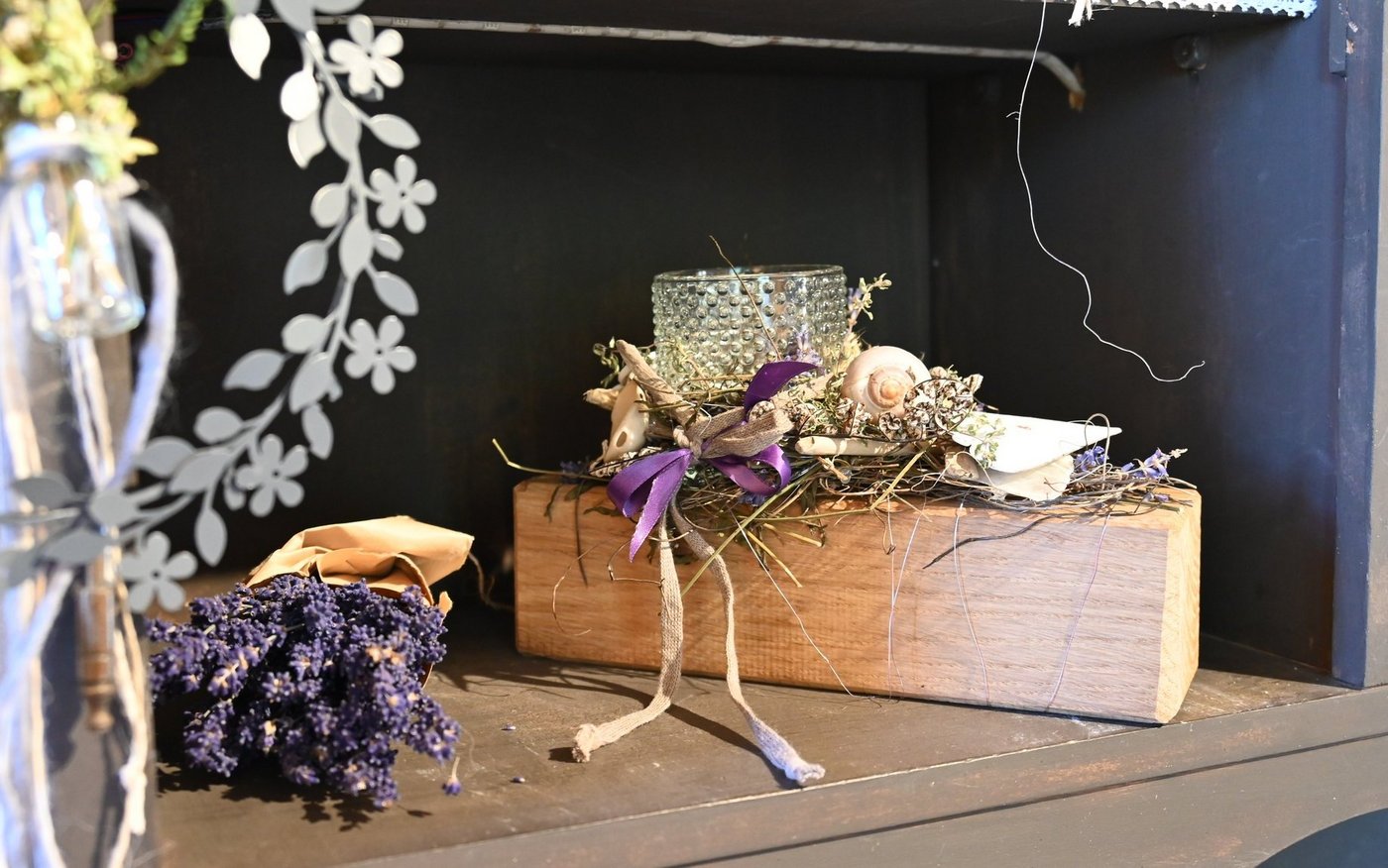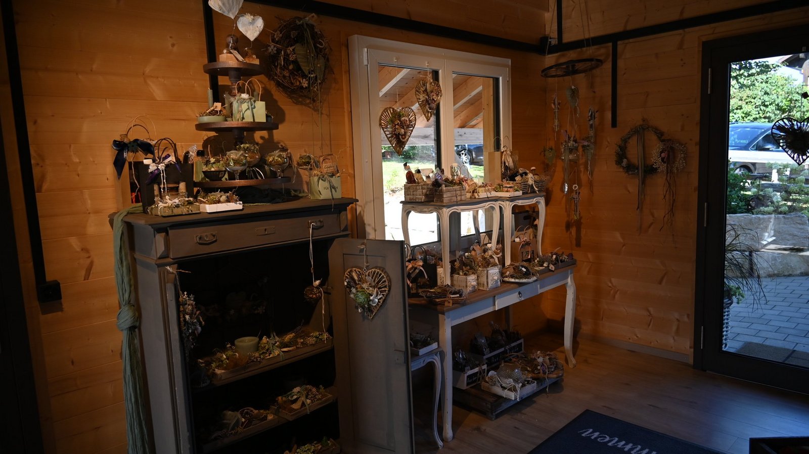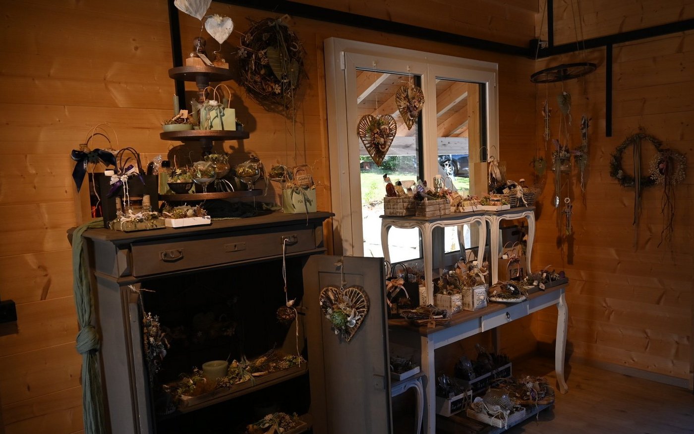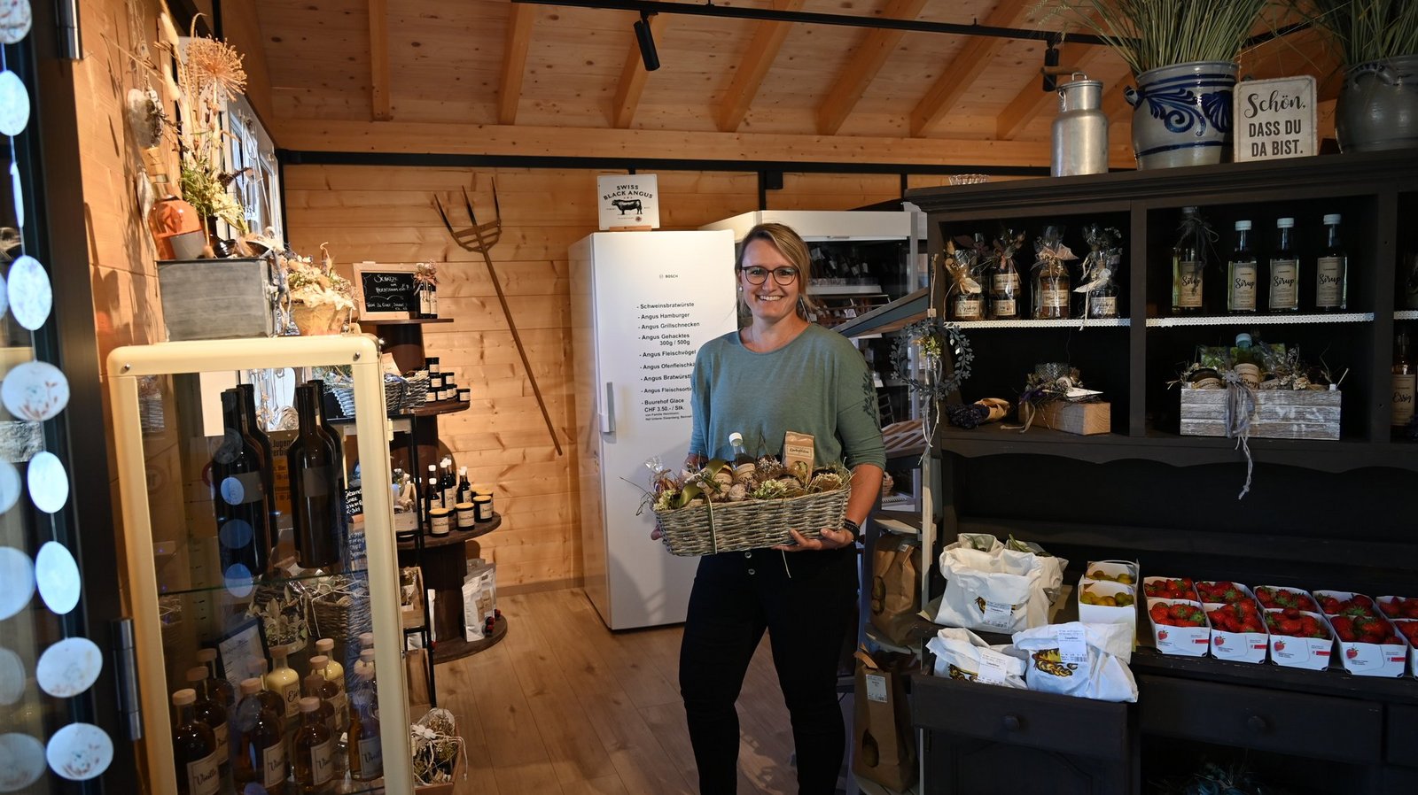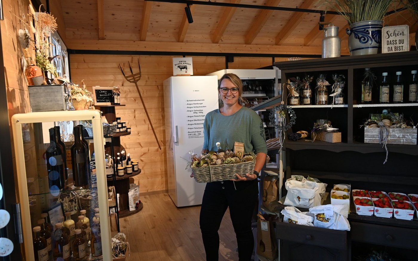 Wenn die Floristin und Bäuerin ihre Kreativität im eigenen Hofladen ausleben kann, gibt es nicht nur Fleisch, Obst, Gemüse, Sirup und Schnaps zu kaufen. So wie bei Carola Degen auf dem Hof Langacker in Ramlinsburg im Baselbiet. Bereits der Eingang des Ladens ist mit viel Liebe und stilvoll, aber keineswegs überladen dekoriert. Genauso sieht es im Inneren aus. Die Waren werden liebevoll präsentiert, überall sind kleine Dekorelemente zu finden, wie geflochtene Herzen, Geschenke mit Kerzen, Geschenkkörbe und -taschen mit selbst gemachten Produkten, dekoriert mit Trockenblumen und Schleifen. Eine Ecke ist gänzlich den Geschenken gewidmet. [IMG 4]