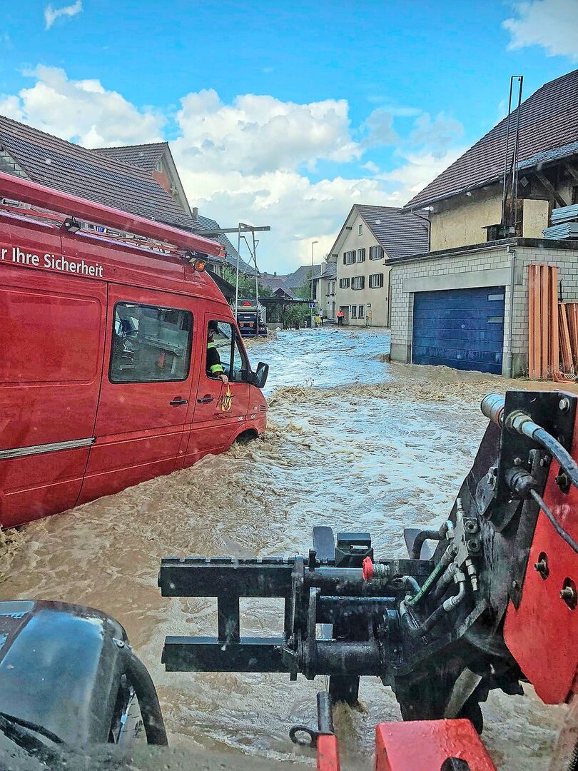 Einige Tage nach dem verheerenden Unwetter sind die Spuren im unteren Klettgau zwischen Siblingen und Hallau vielerorts deutlich sichtbar. In den Dörfern Oberhallau und Gächlingen stehen am Strassenrand und auf Vorplätzen Dutzende grosse, mit verwüstetem Hausrat gefüllte Abfallmulden. Überall wird noch Wasser aus den Keller- und anderen Untergeschossen gepumpt, geputzt oder man ist nach wie vor daran, den arg in Mitleidenschaft gezogenen Hausrat auszuräumen. Ebenfalls betroffen sind Dutzende von Personenwagen in Tiefgaragen oder auch auf normalen Parkplätzen. Diese erlitten grösstenteils einen Totalschaden.
