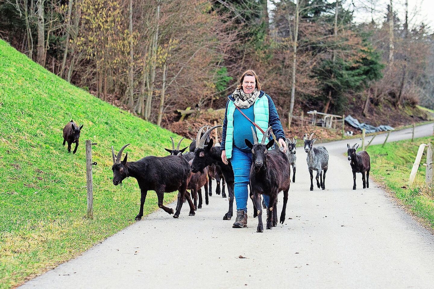 Das Coole am Ziegenwandern sei, dass man mit den Tieren nichts Unnatürliches mache, ihnen nichts aufzwinge. Denn das Laufen für die Nahrungsaufnahme sei ein natürliches Verhalten. Sie passe sich beim Wandern jeweils dem Tempo der Ziegen an: «Die Ziegen sind Feuer und Flamme für das Wandern, das merkt man», sagt sie. Einigen sehe man sogar an, dass sie enttäuscht seien, wenn ein Auto auf den Hof fahre und es nicht Besuch für sie sei. Die Tiere gehen nur an der Strasse oder bei der Querung von Hofplätzen am Halfter, den Rest spazieren sie frei mit.