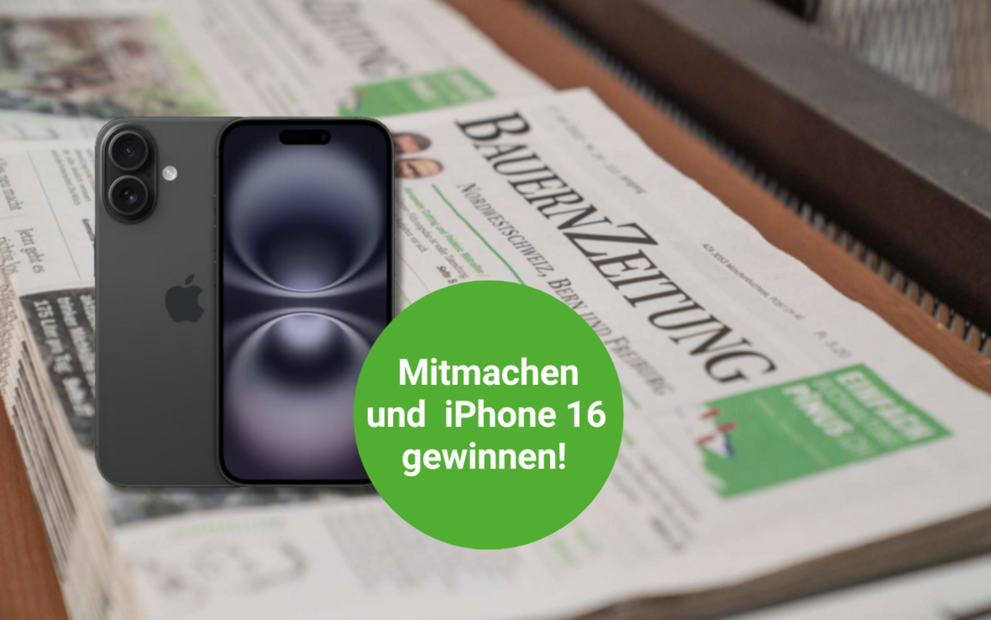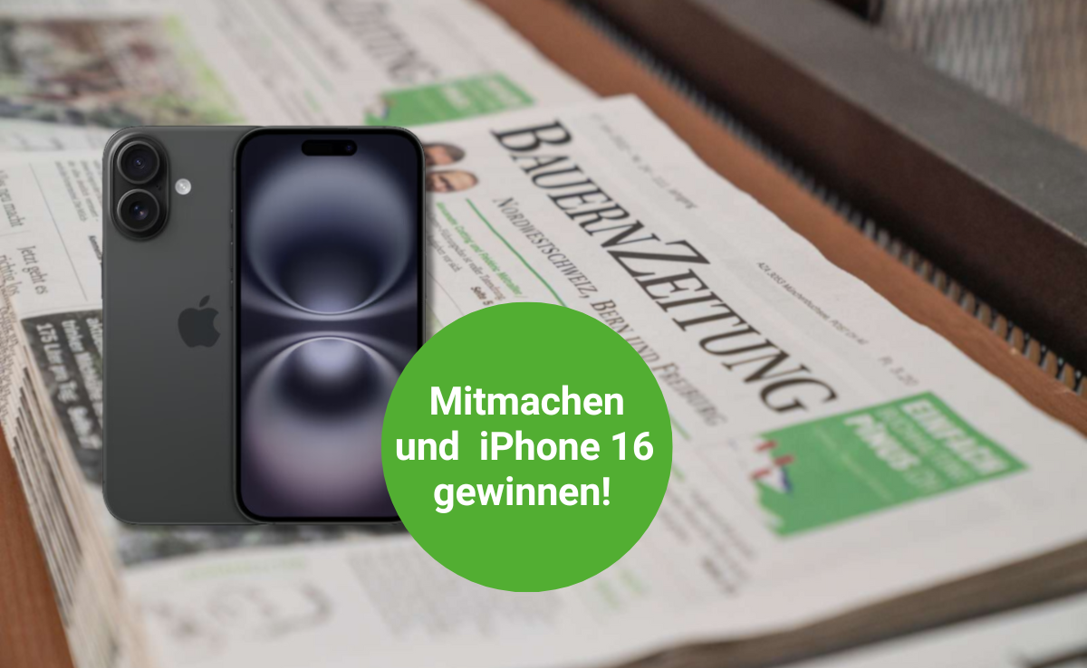 Wo sich PS und Tradition begegnen: Die grösste Schweizer Fachmesse für Land-, Forst- und Kommunaltechnik findet vom 28. November bis 2. Dezember 2024 in Bern statt. Beantworten Sie unsere Fragen zur Agrama, der «BauernZeitung» und «die grüne» korrekt und gewinnen Sie mit etwas Glück ein Apple iPhone 16 (256 GB, Black). Mitmachen können Sie bis am 2. Dezember - viel Glück!