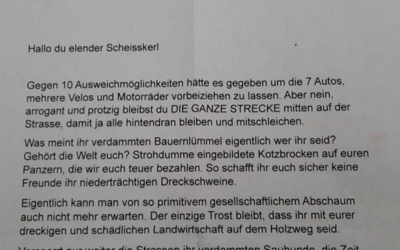Auslöser des Zorns war offenbar ein Mähdrescher, der bei seiner Fahrt auf einer schmalen Landstrasse schlecht bis gar nicht ausstellen konnte. Die Folge war, dass mehrere Autos nur langsam vorwärts kamen. Was für viele Leute vom Land während der Dreschsaison einfach dazugehört, passte einem Autofahrer (oder einer Autofahrerin – bei anonymen Schreiben lässt sich das nicht feststellen) dermassen nicht in den Kram, dass er sich zu Hause hinsetzte und wutentbrannt einen Hass-Brief verfasste – natürlich ohne seinen oder ihren Namen zu nennen.