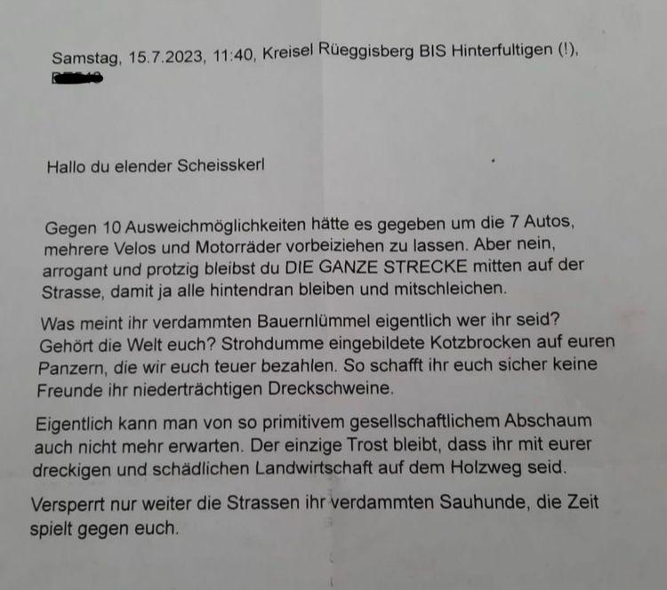 Dass es in der breiten Bevölkerung manchmal an Verständnis für die Landwirtschaft und die Sachzwänge fehlt, ist nichts Neues. Auch dass der Anstand bisweilen flöten geht, wenn Leute das Gefühl haben, sich beschweren zu müssen, ist bekannt. Doch der anonyme Brief, der jüngst bei einem Lohnunternehmen aus dem Bernbiet im Briefkasten lag, übertrifft sowohl im Tonfall als auch in der Wortwahl die meisten «Beschwerden». Oder auf gut Deutsch gesagt: Er schlägt dem Fass den Boden aus. Die BauernZeitung hat das Lohnunternehmen kontaktiert und mit den Betroffenen gesprochen.