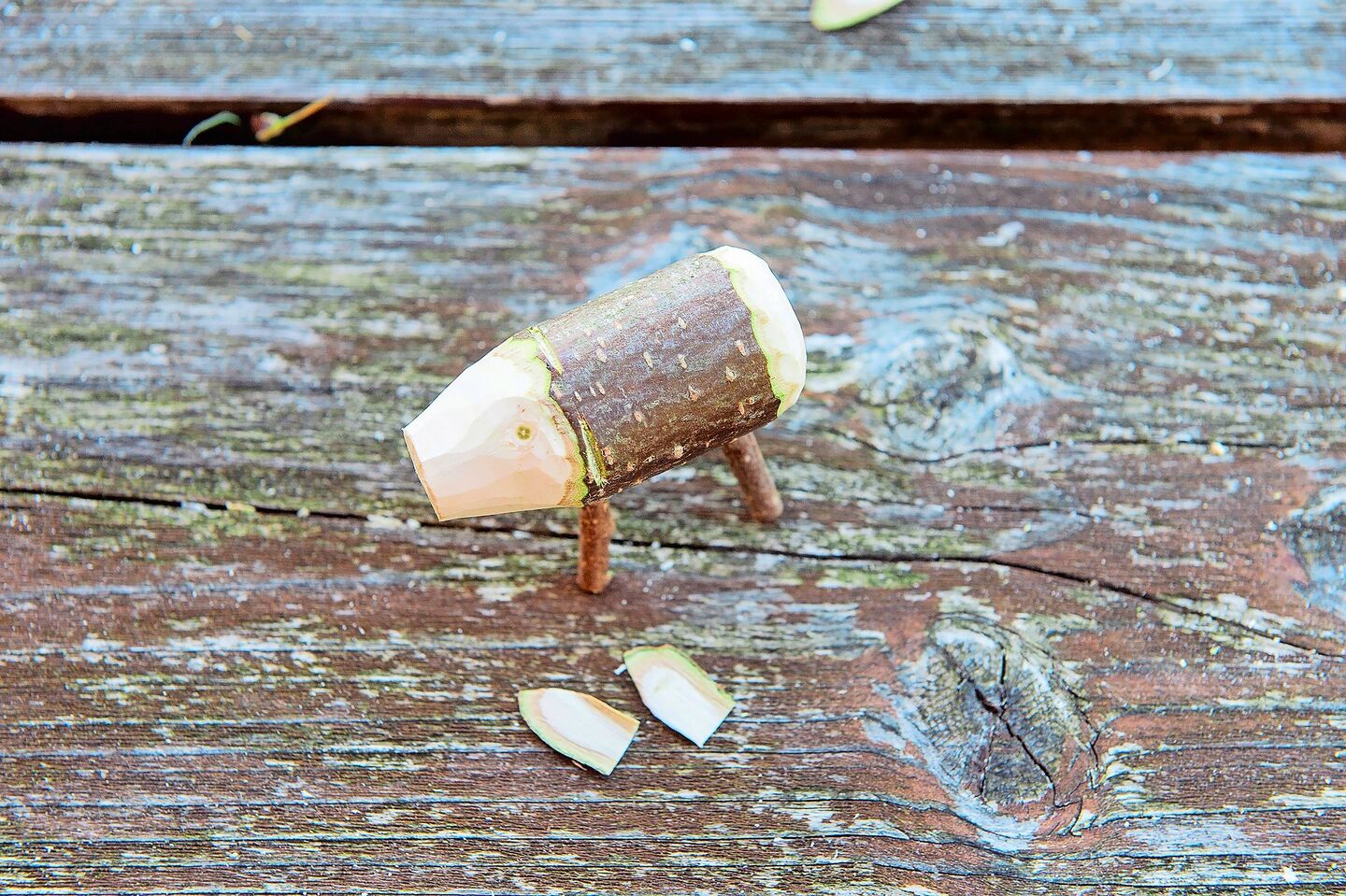- Aus den dünneren Ästen Beinchen herstellen. Das Schwein hat ca. 2,5 cm lange Beine, die Kuh ca. 4 cm.