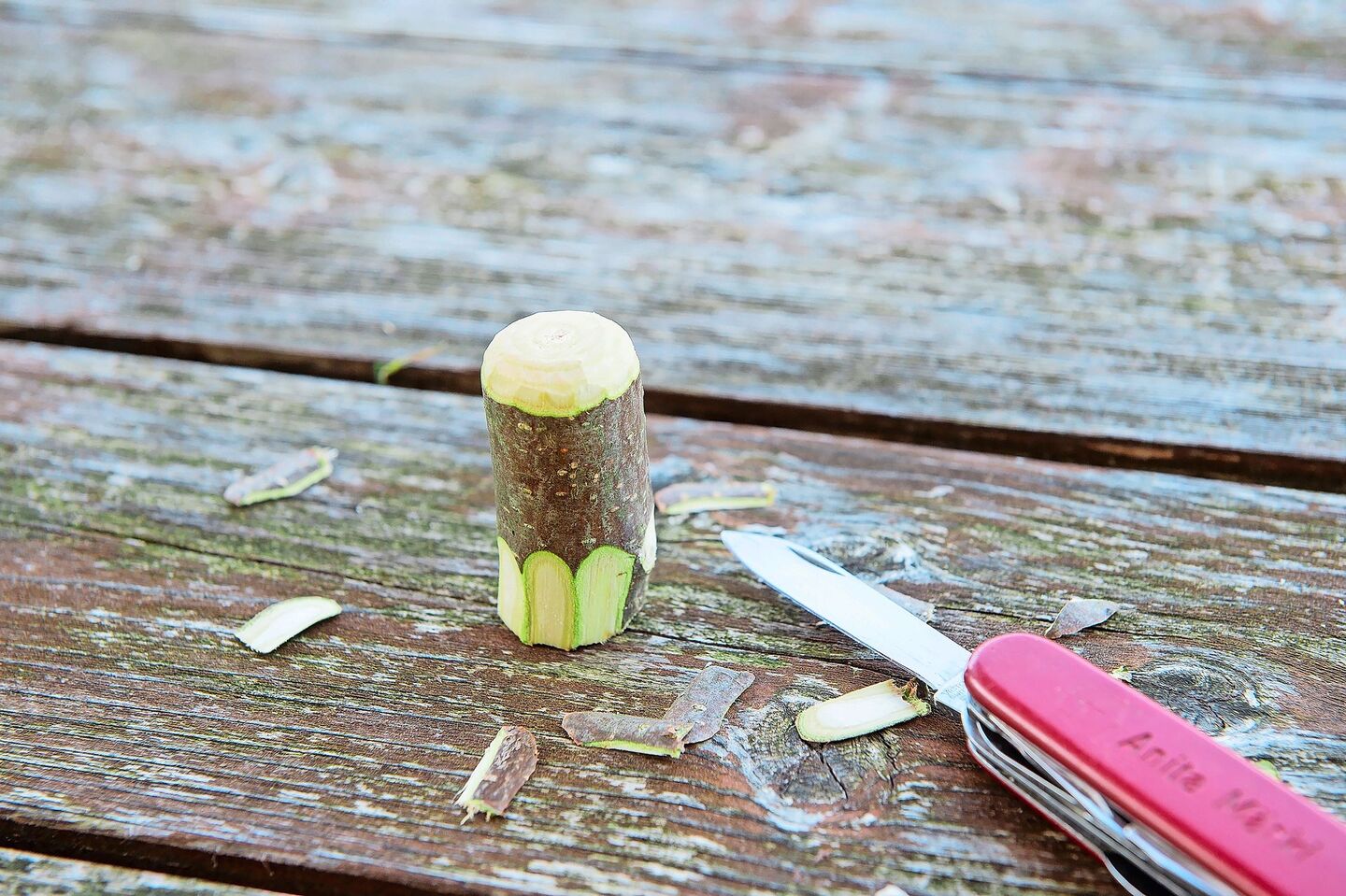 - Das Astende mit dem Taschenmesser abrunden und anschliessend für das Schweinchen ca. 5,5 cm lang absägen, für die Kuh etwas länger.