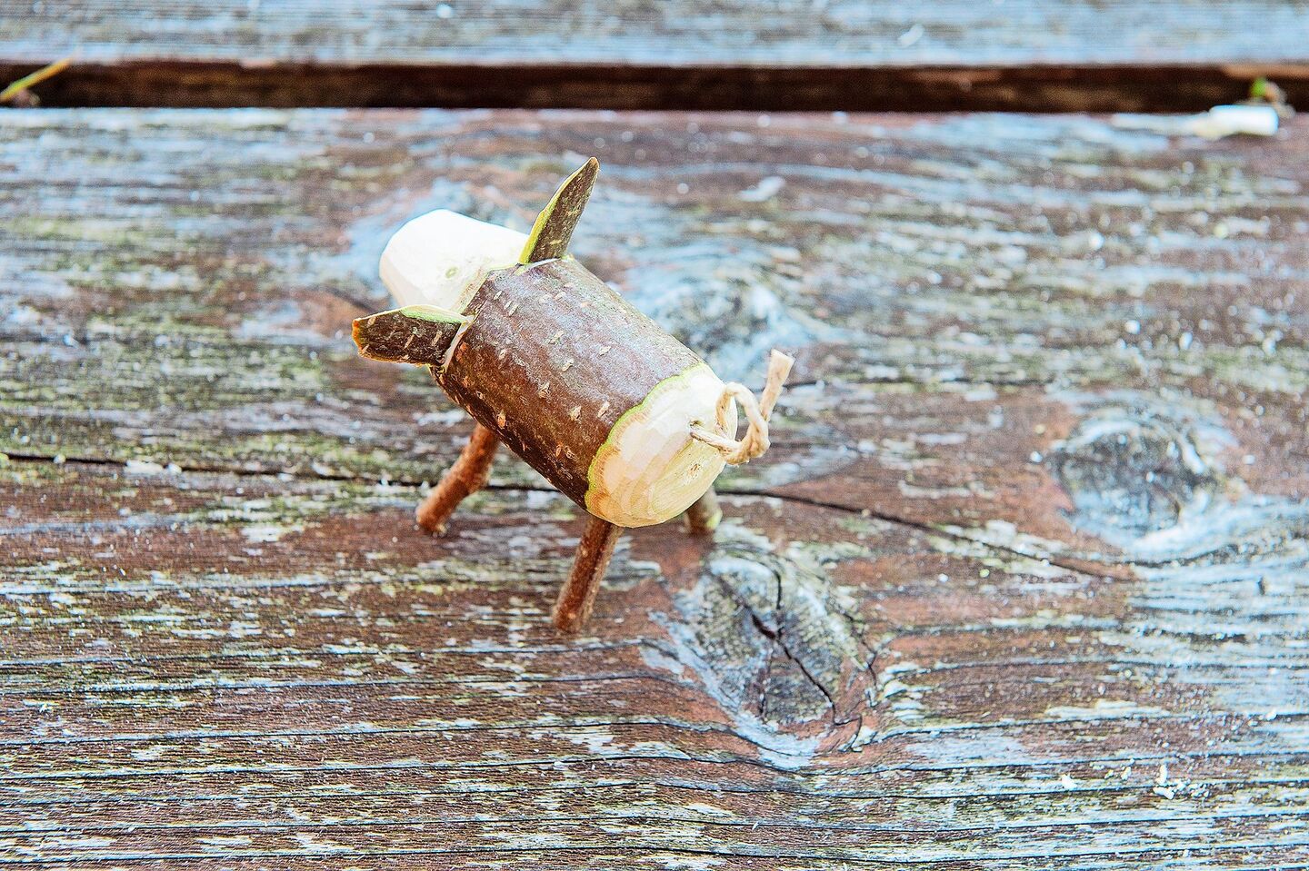 - Beim Schwein für die Ohren seitlich des Kopfes mit dem Taschenmesser Einkerbungen machen. Die zuvor aufbehaltenen Rindenstücke oben etwas anspitzen und mit Holzleim in die Kerbe kleben.
