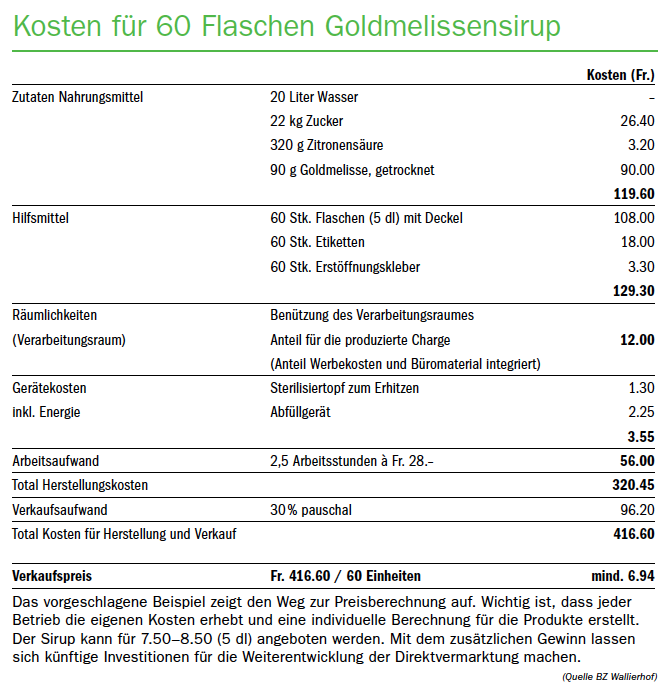 Häufig orientieren sich Betriebsleiter und Betriebsleiterinnen bei der Festlegung ihrer Produktpreise zur Direktvermarktung nach den erhobenen Richtpreisen. Die Kosten für Räumlichkeiten, Geräte oder Kosten für Dritte usw. können aber sehr unterschiedlich hoch ausfallen. Die Produkte sollten deshalb primär nach den persönlichen Gegebenheiten eines Betriebes berechnet werden.