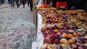 Die Stimmung auf dem Brunnenplatz war herzlich und fröhlich und eine geniale Kulisse für den Anlass. Geflochtene Zwiebelzöpfe hingen und lagen am Marktstand, mit viel Liebe von flinken Landfrauenhänden hergestellt.