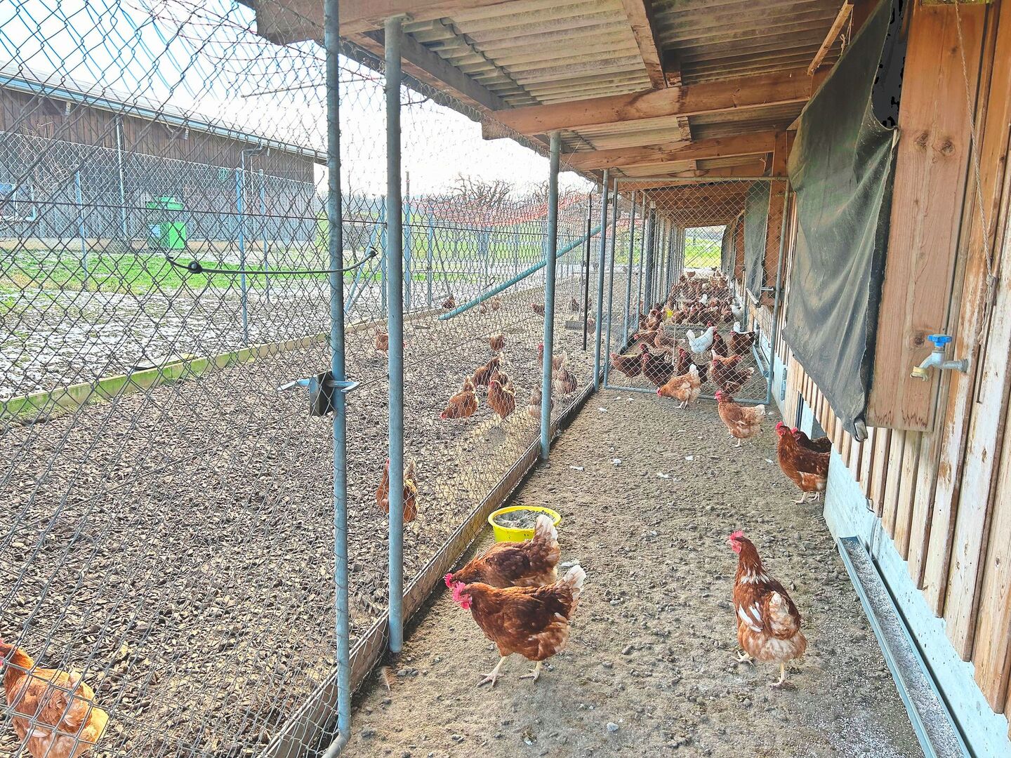 «Wir haben mit 740 Legehennenplätzen eine kleine Freilandhaltung. Jedes Huhn hat 2,5 m2 Auslauf, und das nutzen sie», sagt er. Der 33 m lange Stall ist in fünf Abteile unterteilt, mit Sitzstangen, Legenestern, einem Aussenklima sowie Weidefläche versehen. Bei grosser Freilandhaltung gäbe es immer Hühner, die gar nicht merken würden, dass der Schieber offen sei und die gesamte Legeperiode drinnen verbringen. Bei ihm hingegen finde jede Legehennen den Weg nach draussen ins Sonnenlicht und könne im Gras scharren. [IMG 2] Die Hühner haben Pickschalen mit Mineralstoff, Kalk und Quarzgrit. «Jeden Tag streuen wir Weizen- und Gerstenkerne», erzählt er. Früher liess er die Hühner nach der Legeperiode schlachten. Aber seit einigen Jahren arbeitet er mit einer Tierschutzorganisation zusammen, die alle seine 740 Hühner an Hobbytierhalter vermittelt.