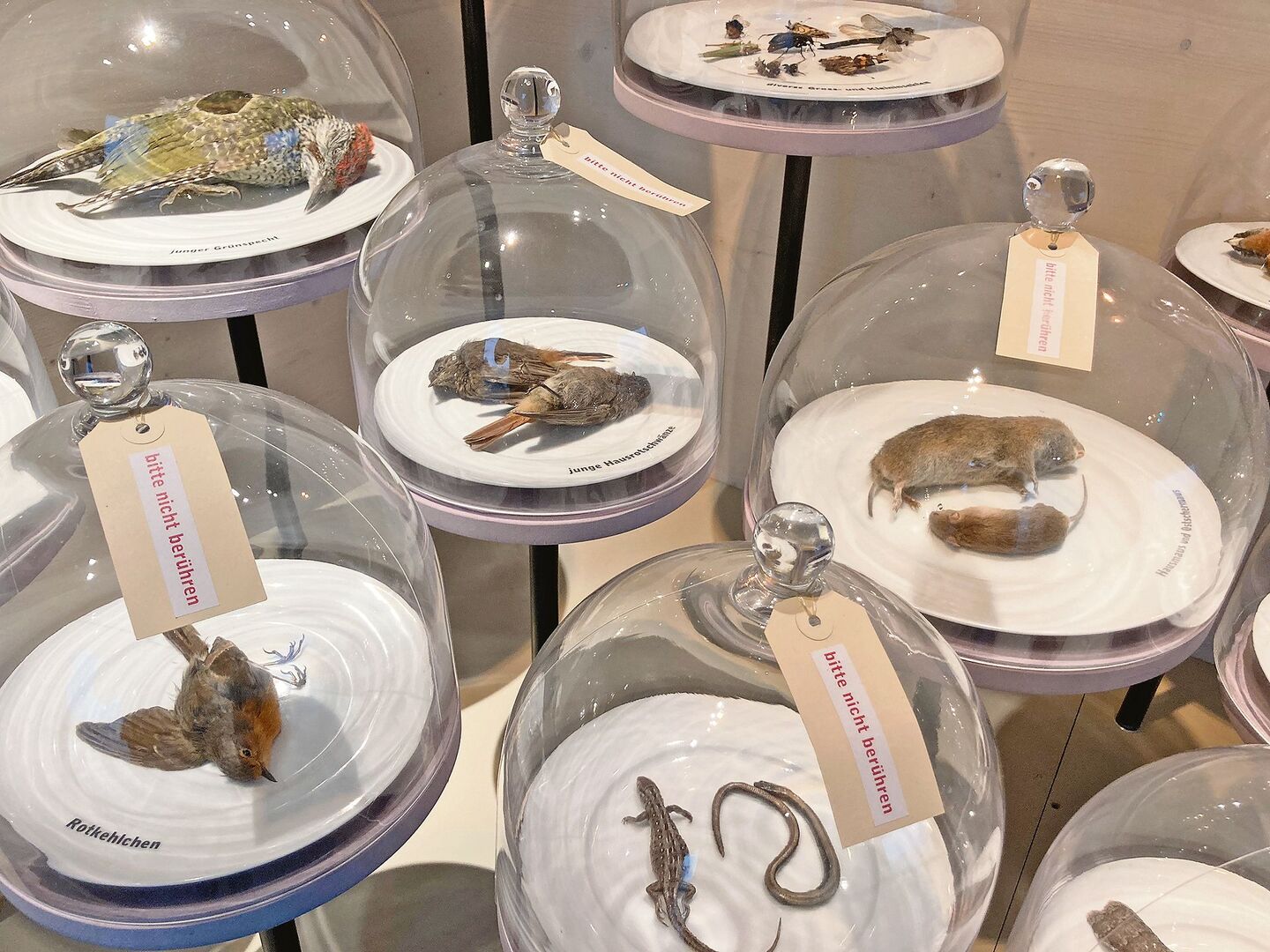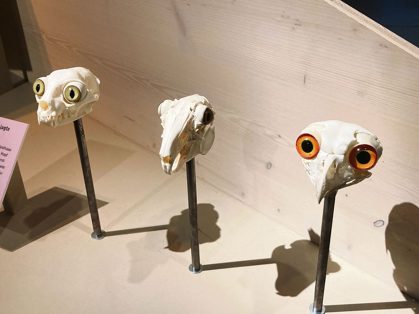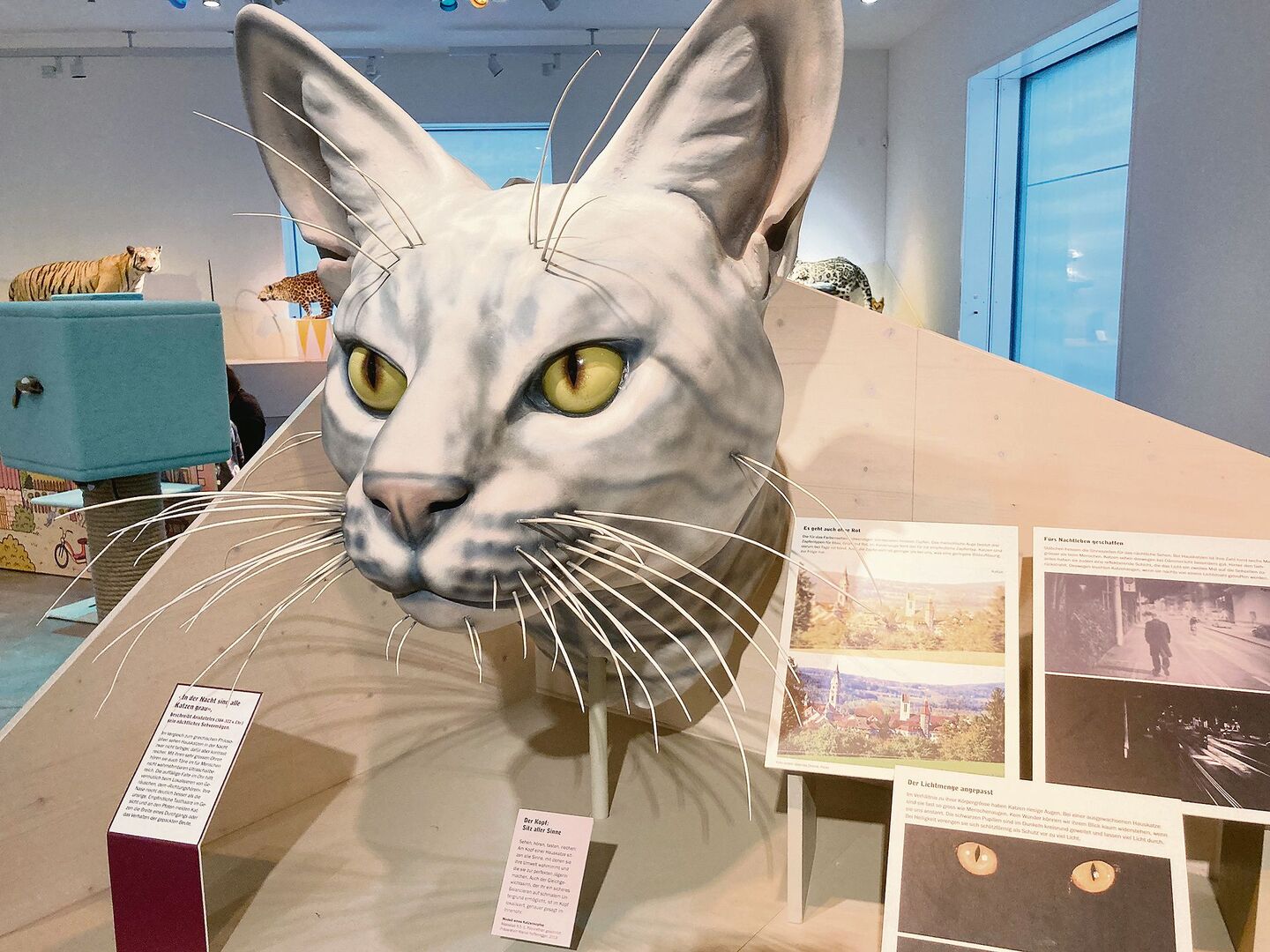 Ein Teil der Ausstellung widmet sich der Biologie der Katze: Zu erfahren ist beispielsweise, dass sie riesige, nach vorne gerichtete und eng beieinanderstehende Augen besitzt, was ihr als Raubtier räumliches Sehen und eine präzise Entfernungsschätzung zur Beute ermöglicht. Fluchttiere wie Hasen dagegen haben Augen, die seitlich am Kopf liegen und somit einen Rundumblick bieten.