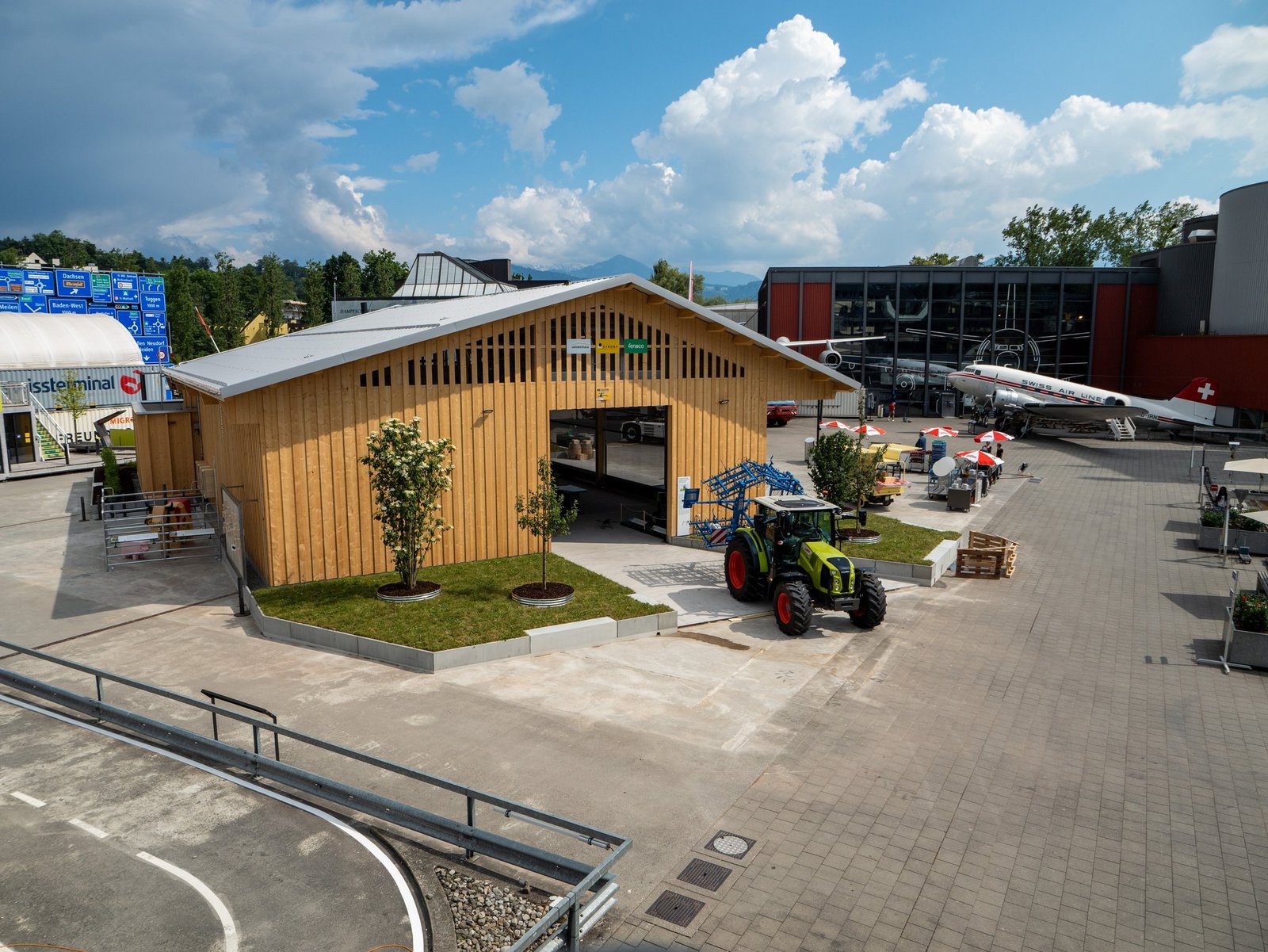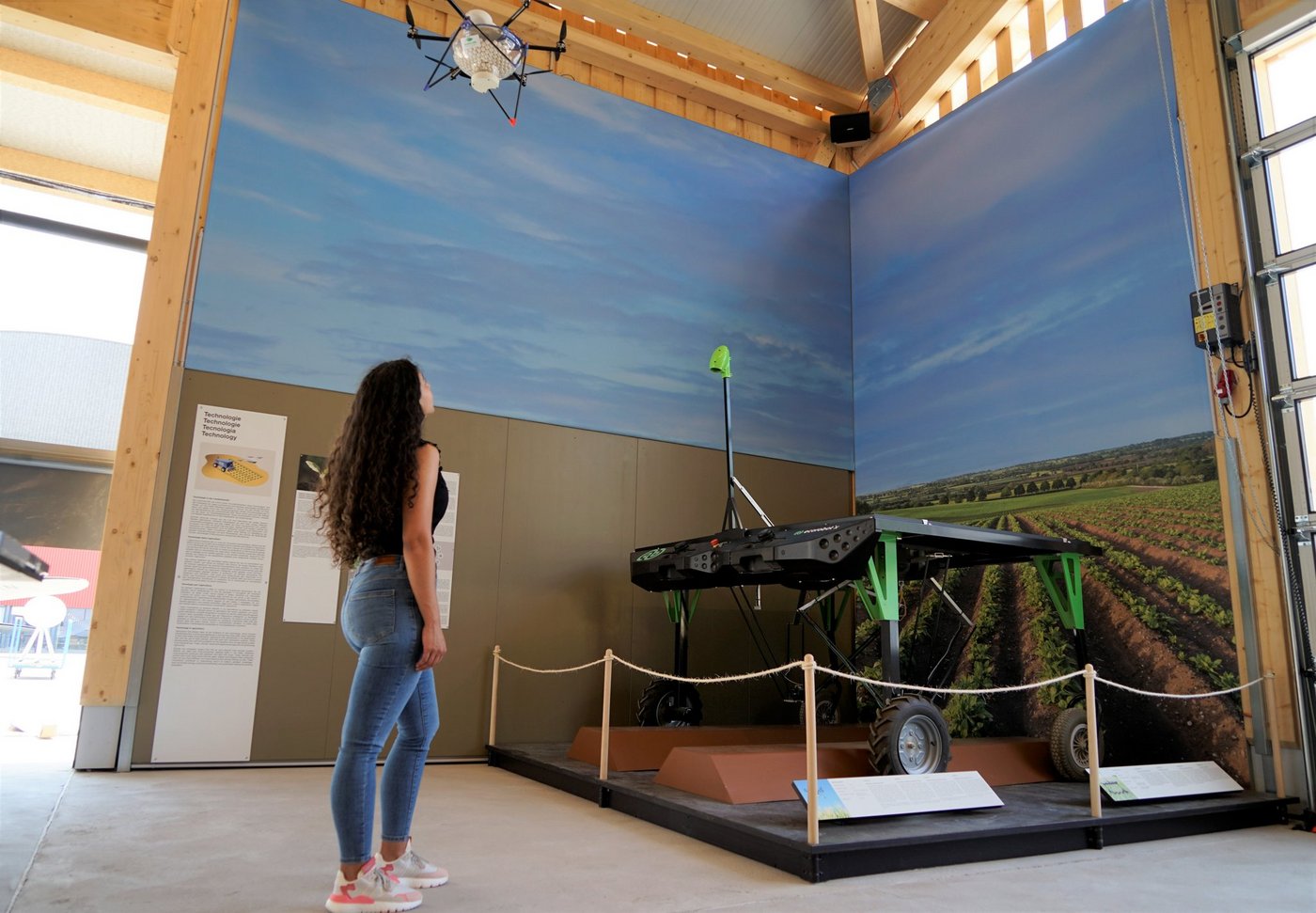 Ein grosser Holzbau mit Schweizer Holz und Solaranlage, davor ein Claas-Traktor – auf den ersten Blick sieht die neue Ausstellung «von Heugabeln und Drohnen» von aussen wie ein normales Betriebsgebäude aus. Aber die lebensgrossen Holztiere im Stall und das nebenan geparkte Kleinflugzeug verraten, dass hier keine Landwirt(in) tagtäglich zu Gange ist.