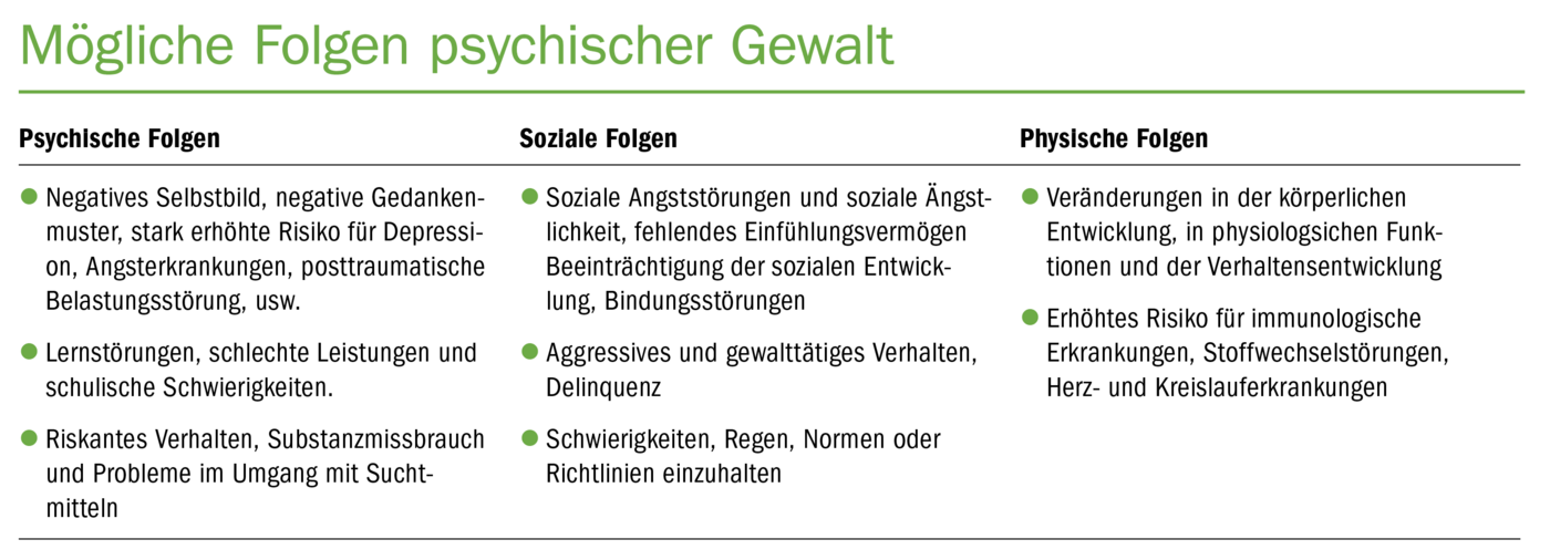 Auch wenn sie keine blauen Flecken hinterlässt, kann psychische Gewalt – vor allem, wenn sie regelmässig angewendet wird – «starke und möglicherweise lebenslange Auswirkungen für die betroffenen Kinder haben, bis ins Erwachsenenalter», so Tamara Parham. Dazu zählen unter anderem: ein stark erhöhtes Risiko für Depressionen, Lernstörungen, aggressives und gewalttätiges Verhalten oder Bindungsstörungen (siehe Tabelle).