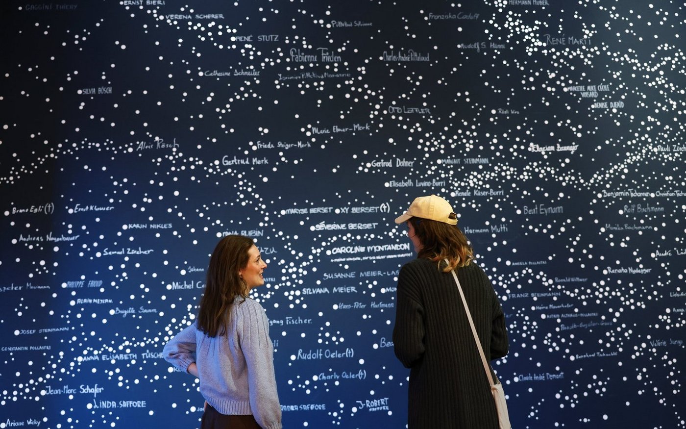 Im Eingangsbereich berührt die Installation «Namen gegen das Vergessen»: 10 826 weisse Punkte auf einer dunklen Wand symbolisieren jene Menschen, die bis Sommer 2024 einen Solidaritätsbeitrag erhalten haben. 295 dieser Punkte wurden an zwei Aktionstagen im Januar von Hand mit Namen beschriftet – durch die Betroffenen selbst, durch Angehörige oder durch das Museumsteam.