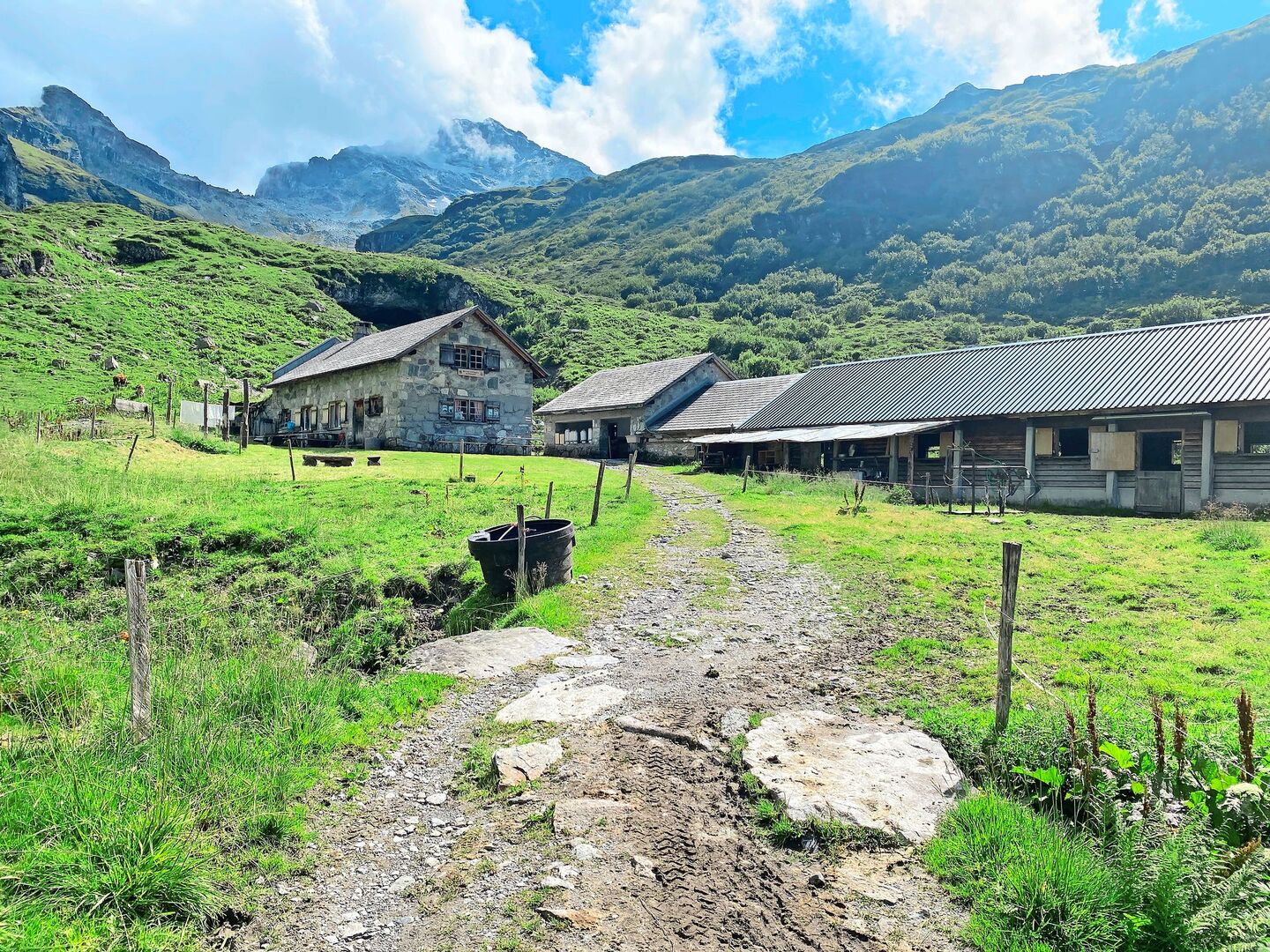 Mit viel Geschaukel geht es mit dem Quad die rund 190 Höhenmeter hinauf zur Alphütte. Sie liegt auf rund 1800 Meter über Meer und am Wanderweg zur Legler-Hütte des SAC. Der Oberstafel beherbergt neben einem Stall und den Räumen für die vierköpfige Alp-Crew auch ein Beizli, in dem es Getränke, Alpkäse oder hausgemachte Nidel-Zeltli gibt.