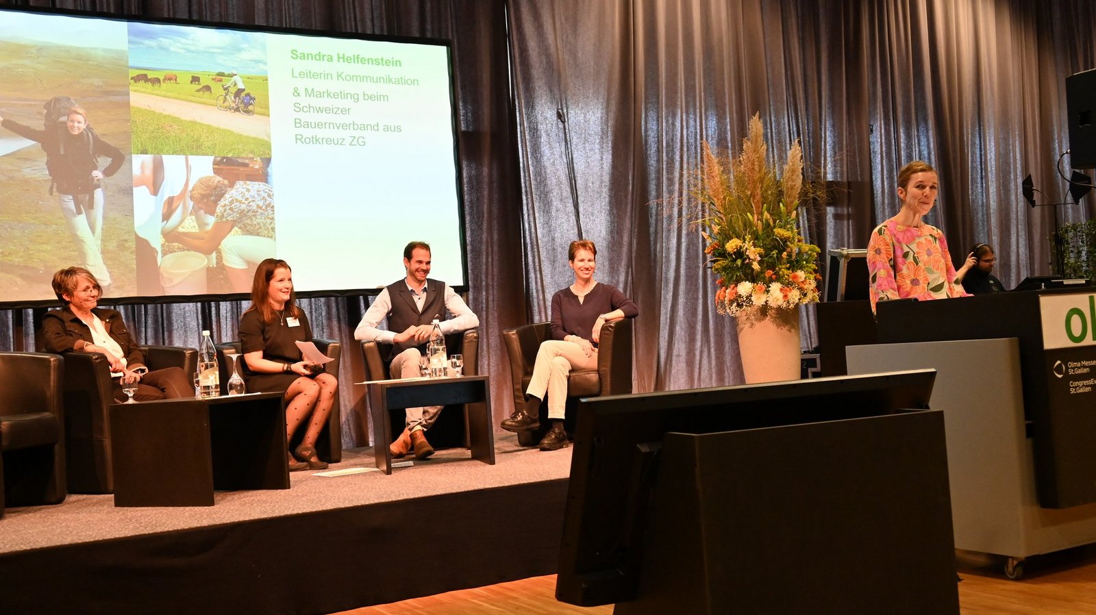 «Reden ist silber. Was ist Gold?» Diesem Thema widmete sich heute der Tag der Bäuerin an der Olma in St. Gallen. Als Podiumsgäste teilten Esther Stricker, Kauffrau, Bäuerin und Beraterin für kollegiales Coachin; Petra Dietiker, Gärtnerin, Bäuerin, Inhaberin einer eigenen Bauernhof-Spielgruppe; Sandra Helfenstein, Leiterin Kommunikation und Marketing beim Schweizer Bauernverband sowie Jörg Büchi, Landwirt, Betriebsleiter, Instagrammer, Treuhand- und Agrarrechtsberater, ihre ganz persönlichen Erfahrungen mit der Kommunikation. Geleitet wurde die Gesprächsrunde heuer zum ersten Mal von Sabrina Lehmann, Moderatorin und Podcasterin. [IMG 3]