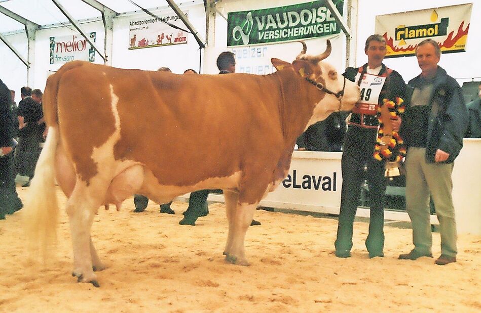 Auf einer anderen steht schön um die Glocke eingraviert geschrieben: «Man ist besiegt, wenn man aufgibt.» «Das ist wie im Leben», ergänzt Albert Wälti, als er den Spruch vorliest. Mehrere Glocken konnte Hanspeter Schütz auch von seiner reinen Simmentalerkuh Fly-Away einheimsen. Die Schönheit gewann unter anderem 1999 an der Expo-Bulle bei den Simmentalern den Schöneuter-Titel. In dieser Zeit habe seine Fly-Away für viel Furore gesorgt. «Ja, das war eine schöne Kuh, mit einem starken Euter», so der Züchter. Einmal triumphierte sie auch an der Reinzuchtausstellung in Burgdorf, wo sie Reserve-Champion wurde. «Eine deutsche Delegation wählte Fly-Away dann zu ‹ihrer› schönsten Kuh und ich durfte als Geschenk diese Glocke von ihnen entgegennehmen», sagt Schütz und zeigt auf eine kleine Glocke, die mit einem gestickten Riemen verziert ist.