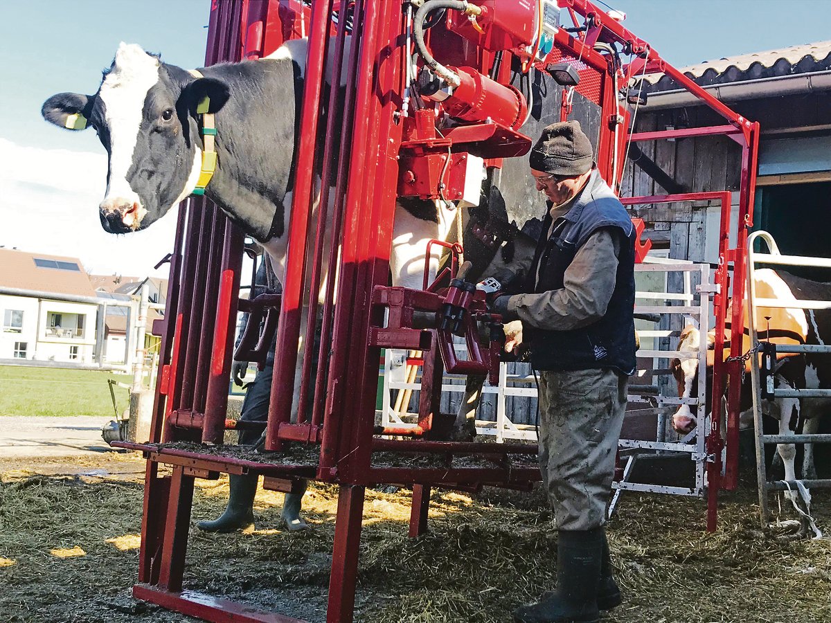 Peter Fenner hat einen mobilen Klauenstand in den Laufhof der Tierhaltergemeinschaft Kägi und Frey gestellt, den ihm eine Landmaschinenfirma zum Ausprobieren zur Verfügung gestellt hat. Besonderheiten des modernen Geräts sind die integrierte Fangbox sowie die hydraulische Hebevorrichtung und Bedienung. «Damit ist es viel einfacher, die Tiere in eine für den Pfleger optimale Position zu bringen», meint er. «Mittels Hydraulik können die Beine einzeln hochgezogen werden, das erleichtert die Arbeit sehr.»
