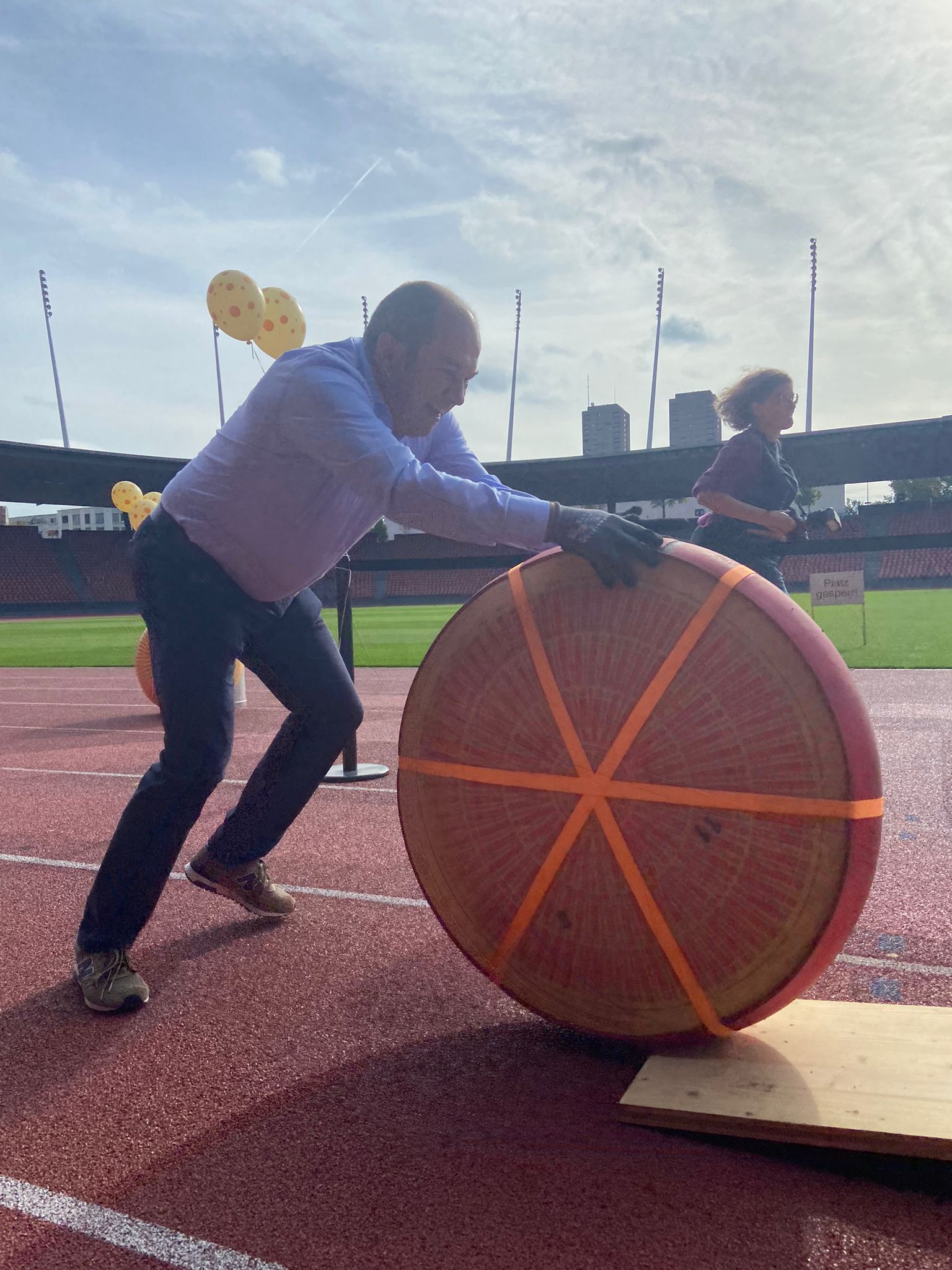 Am Mittwoch, 25. September 2024, bot sich hier jedoch ein ganz anderes Bild. Eine Handvoll Menschen rollte einen 105 kg schweren Emmentaler AOP-Laib über einen Parcours, durch einen Slalom, über eine Wippe und – dafür war ein besonderer Kraftakt vonnöten – über drei Autoreifen.