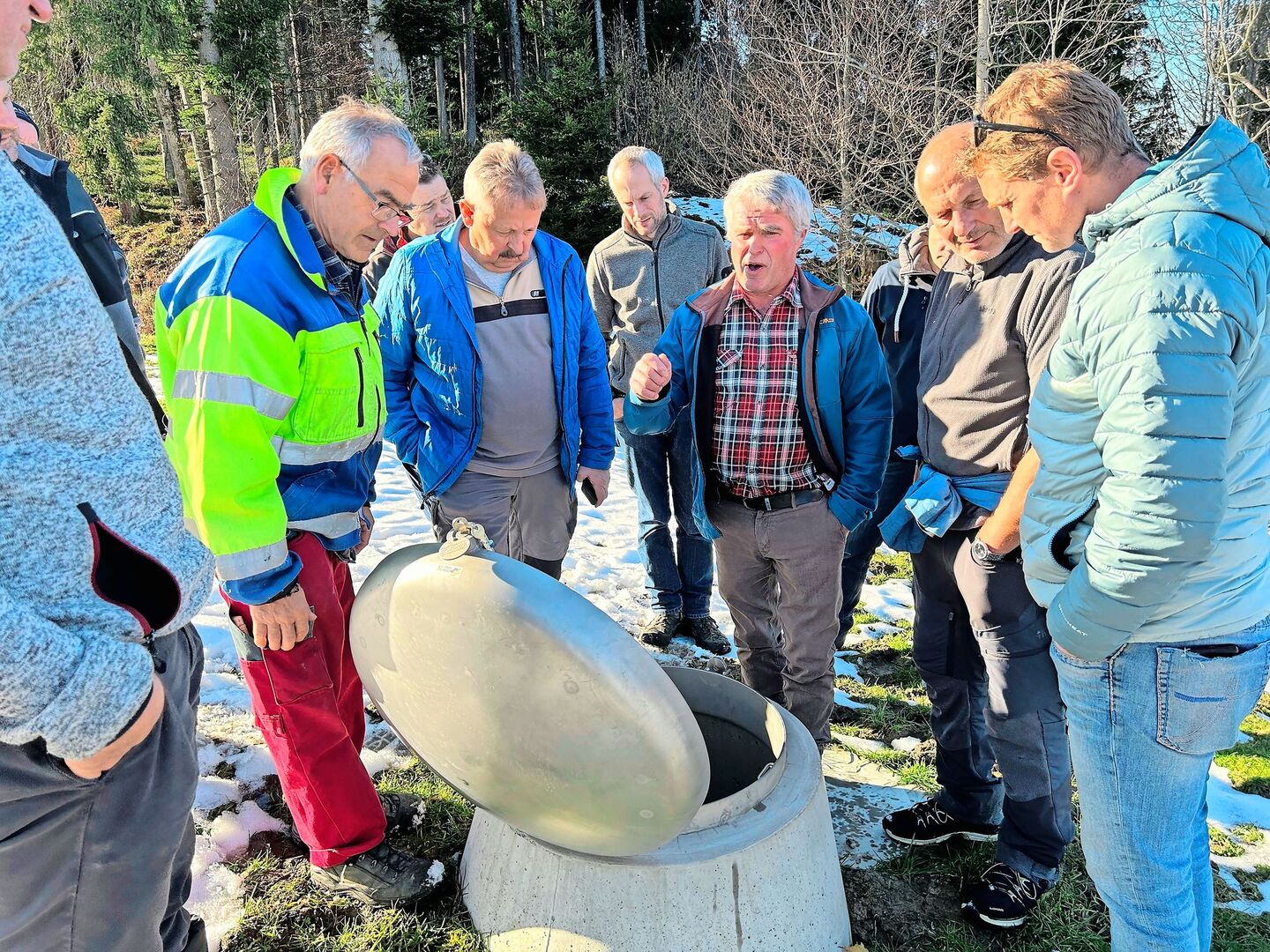 Bei den Erdleitungen müsse man den natürlichen Wasserlauf berücksichtigen. Erst müsse das Wasser ungehindert abfliessen können, dann erst könne man es zur Brunnenstube umleiten. So führte Johannes Bodenmann die Teilnehmer zur Brunnenstube. Dazu wusste auch Bruno Forrer einiges zu sagen: