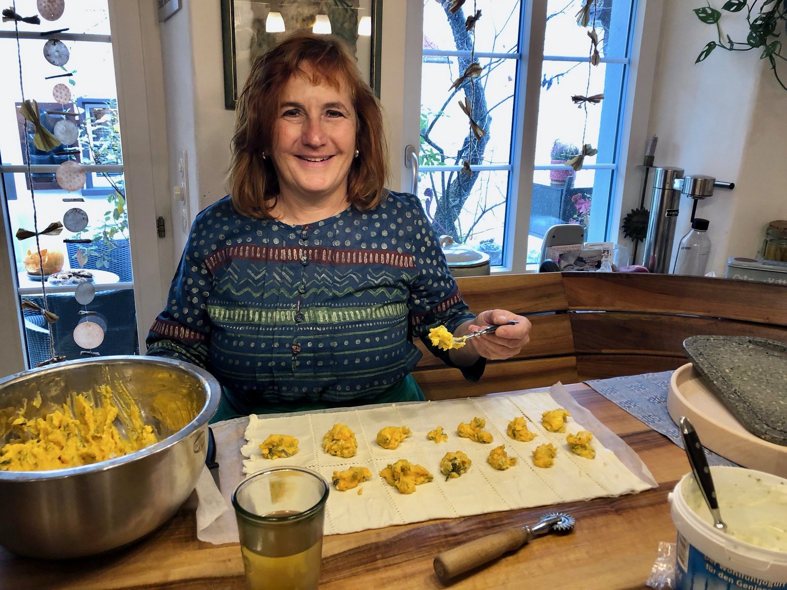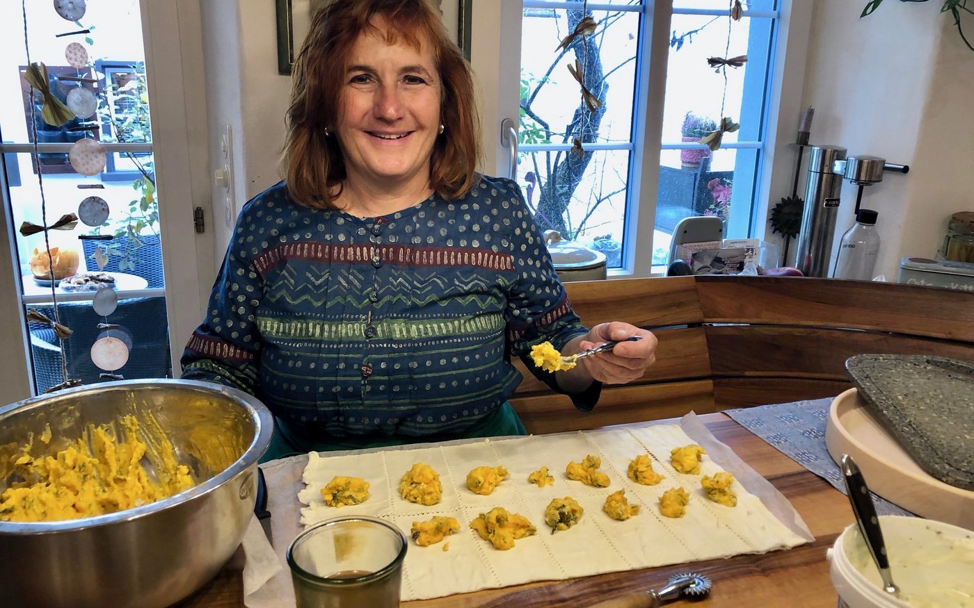 Zur Vorspeise gibt es Nüsslisalat mit einer Kürbis-Ricotta-Kräuter-gefüllten Blätterteigtasche und Joghurtdipp. «Ich bin eine Kräutertante», outet sich Claudia Frei. Sie mag es, Kräuter zu sammeln bevor ihre Gäste kommen. «Ich habe mir lange überlegt, ob ich etwas mit Girsch oder Brennnesseln machen soll, habe mich dann aber anders entschieden.» Als Gruss aus der Küche, wie sie es nennt, gibt es im Anschluss eine Kürbissuppe in der Tasse. Die ist mit einer speziellen indischen Curry-Mischung gewürzt und wird von einem Stück Focaccia mit Rosmarin und Kürbiskernen begleitet.