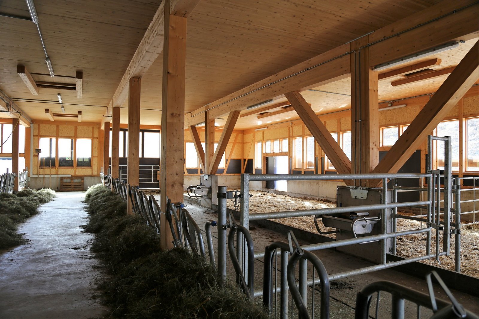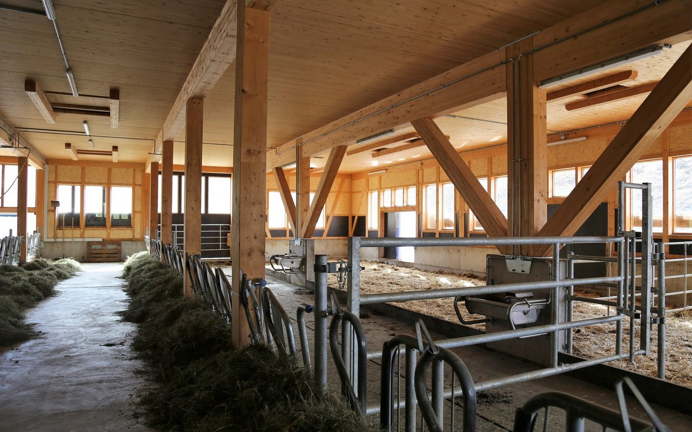 Ins Auge fällt insbesondere die Raumhöhe, die für einen Betrieb auf dieser Höhe sicher etwas speziell ist. «Aber so ist es einfach viel heller und die Luft ist besser – wir hatten so noch nie Probleme mit feuchter und stickiger Luft», erklärt Dominik Menn. Und mit dem Stall kamen auch grosse Erleichterung für den Landwirt selbst: «Mit dem Heukran oder der Entmistung geht es heute schon viel einfacher», schmunzelt er.