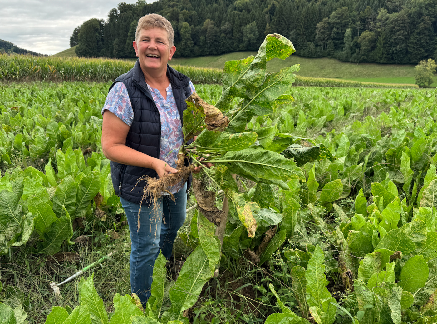 Auf dem Feld zeigt Lucia Schmid, wie sie mit einem Blackeneisen einen Meerrettich ausgräbt: «Normalerweise machen wir das mit einer Maschine», sagt sie lächelnd. «Es ist dennoch eine harte Arbeit.» Verwendet werden alle Teile der Wurzeln: Die schönen Wurzeln kommen in den Verkauf, die verletzten werden getrocknet und zermahlen, der Abschnitt wird zum Tierfutter verarbeitet.