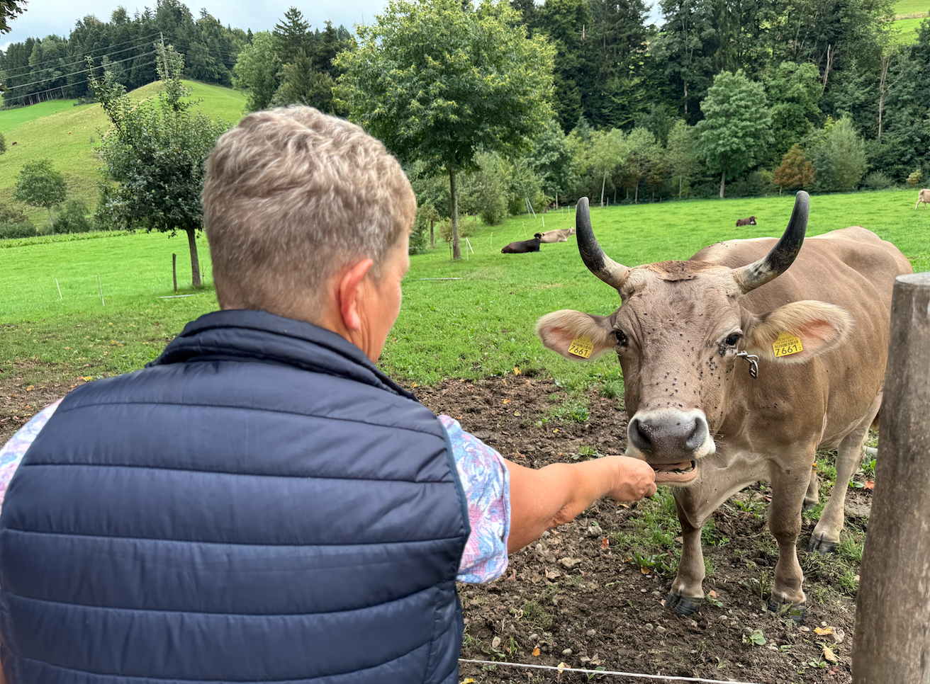 «Bediene dich» sagt Lucia Schmid lächeln und zeigt in der Küche auf die wundervoll hergerichtete Platte. «Ich habe Gurken, Tomaten und Feigen, alles aus meinem Garten, gefüllt mit unserem Schlossere Meerrettichfrischkäse zubereitet». Das lässt sich die Schreiberin nicht zweimal sagen: Es schmeckt vorzüglich. «Es ist auch sehr gesund», erklärt die Bäuerin.