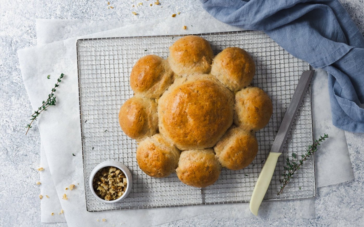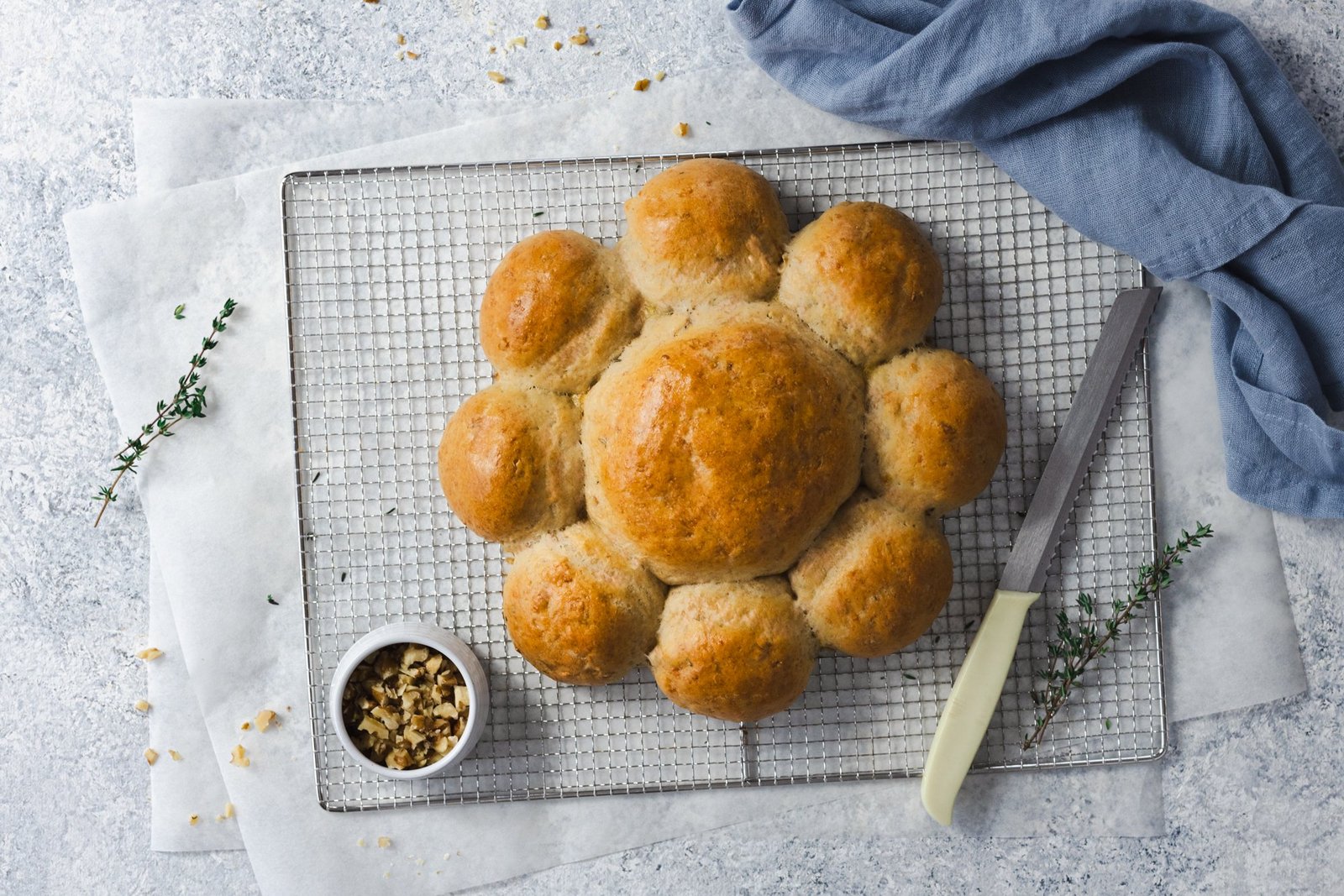 - Wenn der Teig fast homogen ist, nach und nach den Emmentaler AOP, danach Baumnüsse und Thymian zugeben, während der Knethaken weiterhin rührt.