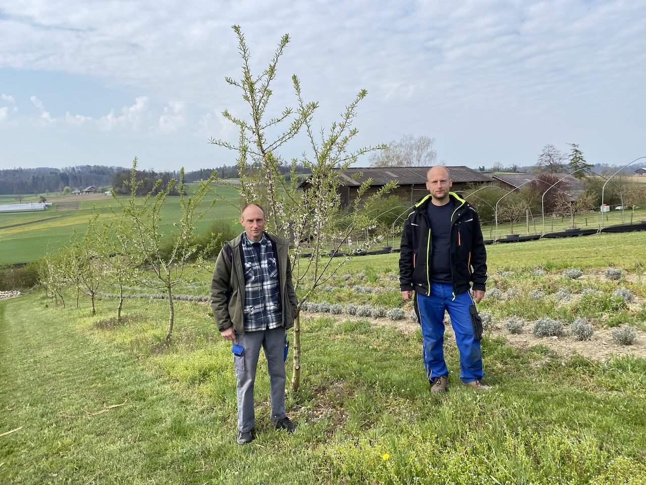 Bei der Pflege ihrer Kultur gehen die beiden Landwirte nicht anders vor als bei Obstanlagen: Um die Baumscheibe wird oberflächlich gehackt, und in der Reihe gemäht, um Mäuse fernzuhalten. Zwischen den Stämmen wachsen bunte Wiesenblumen. «Das sind keine Problemunkräuter», erklärt Oliver Brupbacher. Beim Schneiden ist eine offene Krone das Ziel, damit möglichst viel Luft und Licht in das Geäst dringt.