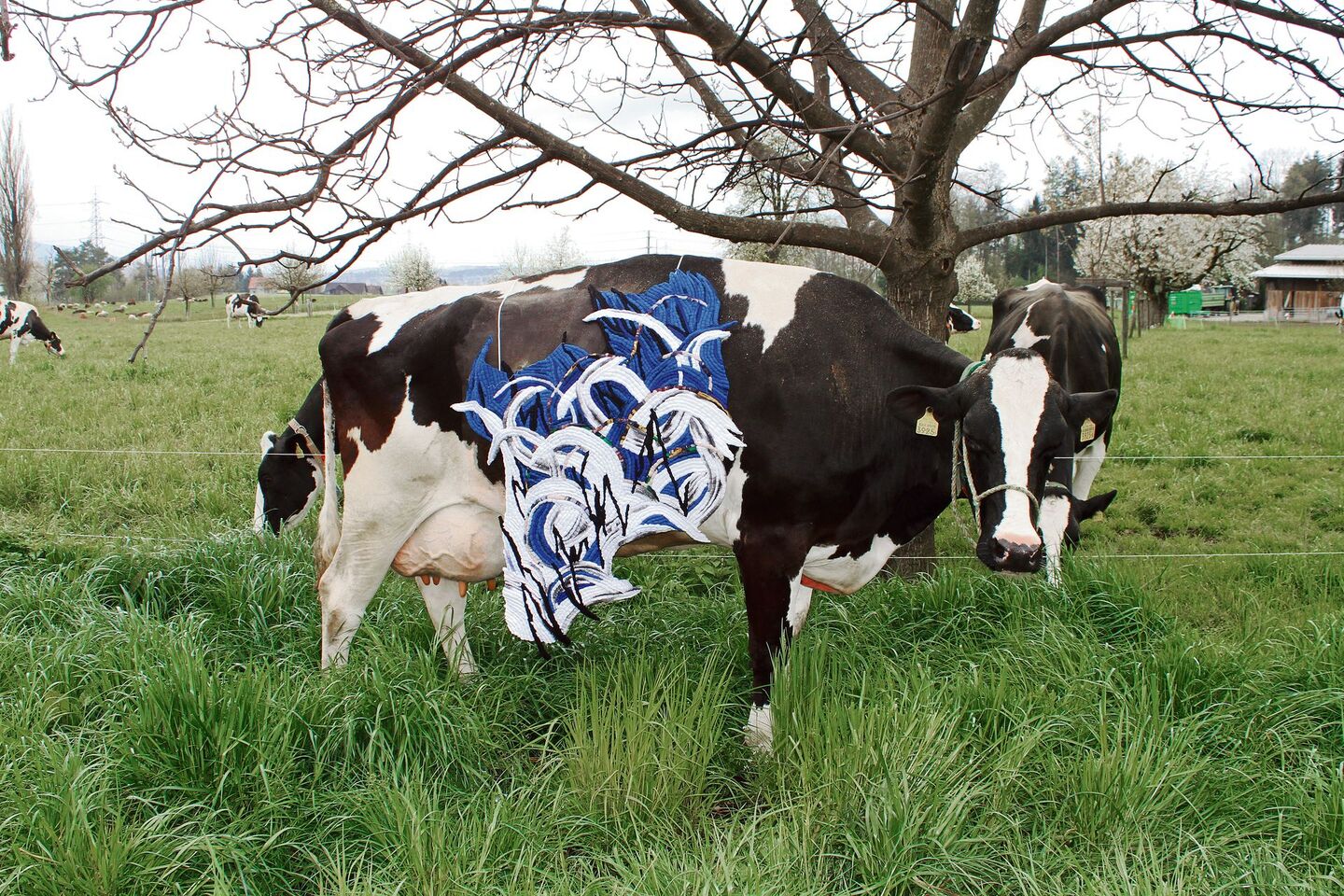 Das Projekt sei sehr unkompliziert zustande gekommen, gibt Alexandra Schelbert Auskunft. «Markéta Jáchimová ist die Freundin einer ebenfalls kunstschaffenden Freundin von mir, die mich auf der Suche nach einem Landwirtschaftsbetrieb kontaktierte.» Warum nicht, sagte sie sich. Sie sei grundsätzlich offen für spartenübergreifende Aktionen, Zugänglichkeit tue der Landwirtschaft gut. Und für die Kühe sei es keine grosse Sache gewesen. «Diejenigen, die keine Lust hatten, konnten auf der Weide davon ziehen.» Im Rampenlicht standen für einmal nicht Tiere, die nach züchterischen Massstäben die schönsten wären, sondern gelassene und neugierige. Die nahm Alexandra Schelbert an die Halfter, die Künstlerin schmückte sie mit ihren Teppichen und fotografierte sie, nach ein paar Minuten weideten die Kühe weiter.