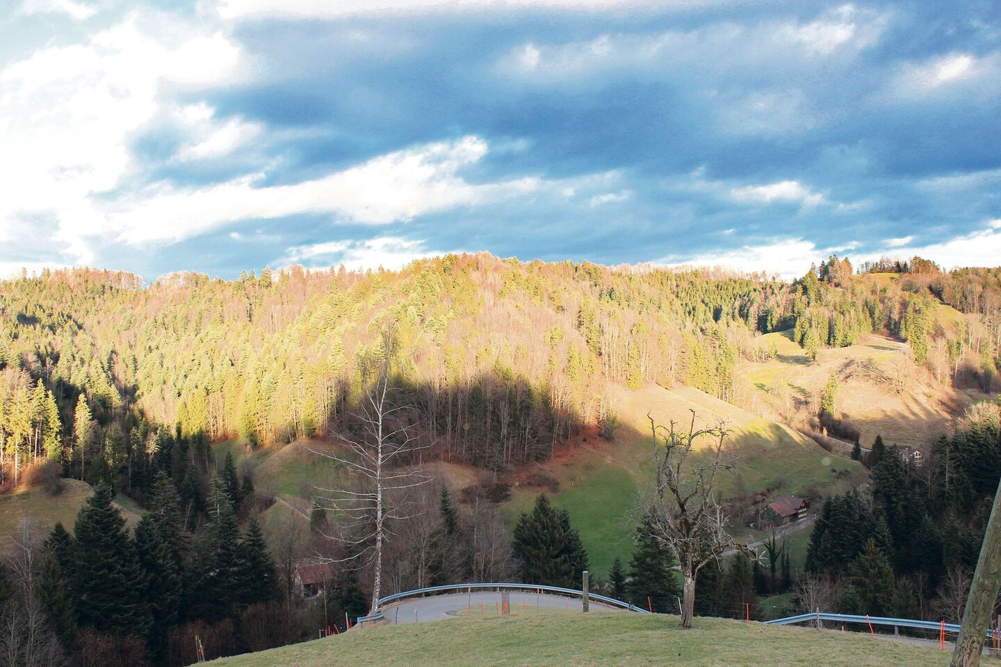 Ab Bauma wird die Strasse schmäler, die Häuser weniger, der Wald mehr. Gegenverkehr fehlt bis zum Dorf Sternenberg auf 900 Meter. Ab da führt ein schmales Strässchen zweieinhalb Kilometer bergab zum Schürlihof. Nun ist klar, warum Martina Guyer vor dem Besuch schrieb: «Hier noch der Link auf Google Maps, so dass Sie uns finden am Ende der Welt.»