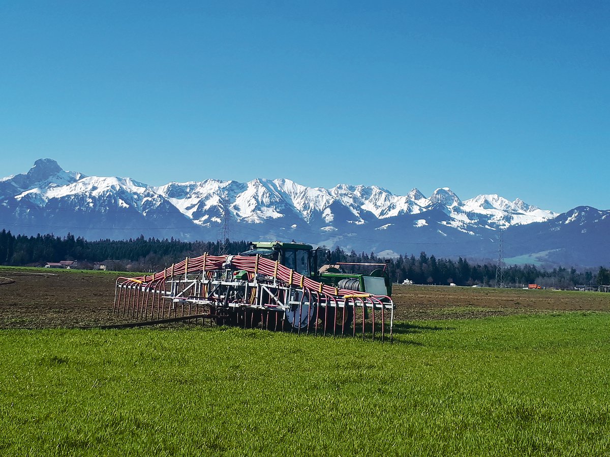 Auch Gülle ist ein Arbeitsfeld. So holen Rohrbachs regelmässig Gülle ab, wo sie zu viel ist und pumpen diese in eine Grube, die noch Platz hat, oder in eine Biogasanlage. Aus diesem Grund besitzen die Unternehmer einen Lastwagen mit Transportfass, ein Transportfass für den Traktor und auch noch zwei weitere Güllefässer. Auch Verschlauchen gehört zum Angebot. Mit einem 1000 m langen Schlauchhaspel können sie Gülle ab Fass vom Feldrand oder aber direkt vom Gülleloch mit dem Schleppschlauch ausbringen. «Dies schont den Boden, weil wir dazu auch nur unseren kleinsten Traktor mit Doppelrädern benutzen», sagt Michael Rohrbach, der die Organisation für den Bereich unter sich hat. Nebst der Gülle gehört auch das Kalken, sowohl flüssig als auch fest, zu seinem Verantwortungsgebiet. Flüssiger Kalk fällt im Kieswerk an und wird direkt in die Gülle eingerührt, erklärt der 35-Jährige. «Ansonsten würde der Kalk gleich auf den Boden der Grube sinken. So jedoch bleibt er gebunden». Flüssigkalk wertet den Hofdünger auf und vermeidet Verbrennungen im Sommer.