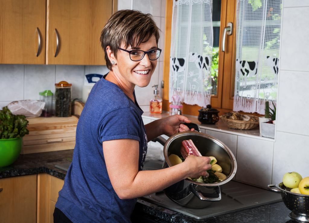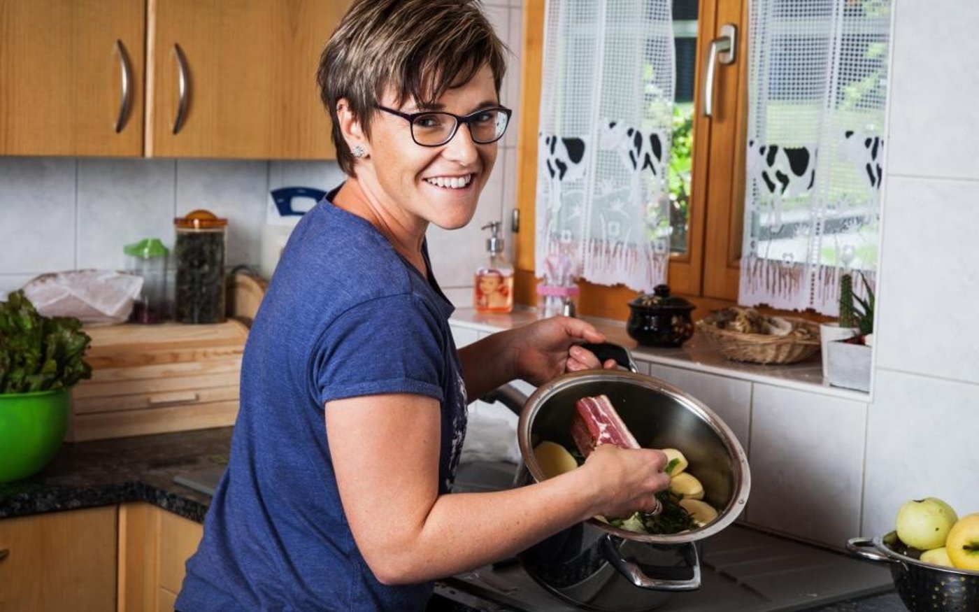 Was bei der Berner Bio-Milchbäuerin aber in keiner Suppe fehlen darf – und natürlich auch Zutat in der Vorspeise des Landfrauen-Menüs war – ist Maggikraut. «Sonst ist es keine Suppe», sagt Sonja Schilt mit einem Lachen. Allerdings müsse sie sich jeweils etwas zurückhalten, um es mit dem duftenden Grün nicht zu übertreiben. Dies auch den Kindern zuliebe, die aber keine heiklen Esser seien. «Hunger ist der beste Koch, würde ich sagen», ergänzt die dreifache Mutter. Zwar achtet Sonja Schilt darauf, dass alle mögen, was auf dem Tisch steht. Dass die Kinder aber jeweils hungrig von der Schule kommen, ist durchaus hilfreich. Ausserdem hätten sie immer von allem probiert und seien daher offen für Neues.