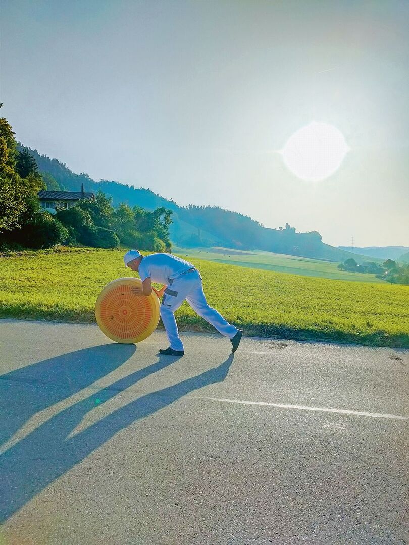 Lukas Liebendörfer: Die Grundidee des Rollens stammt von Käsereimeister Christoph Glauser. Früher wurden die 80 bis 120 kg schweren Emmentaler zum Verladen aus der Käserei gerollt. Da die Anzahl der zertifizierten Emmentaler-AOP-Käsereien in den letzten Jahren stark gesunken ist, kam uns die Idee, symbolisch einen Emmentaler vom Herstellungsort in Zäziwil bis in den Verkaufsladen in Winterthur zu rollen. Mit dieser Aktion möchten wir nicht nur jammern, sondern aktiv etwas gegen das Schwinden der Emmentaler-Käsereien unternehmen.