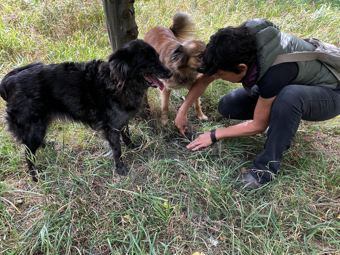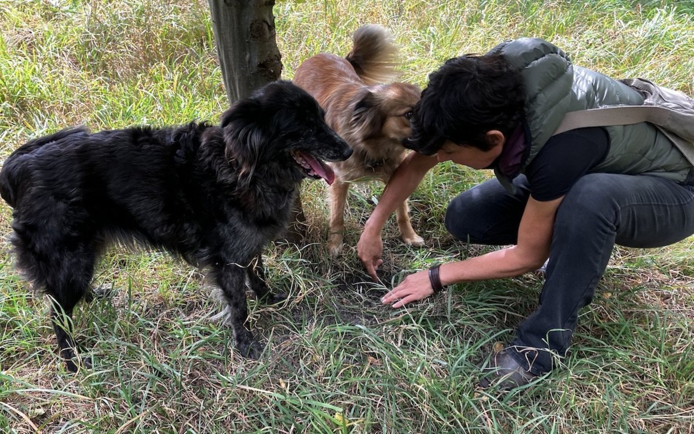 Indy und Taro, ihr zweijähriger Sohn, geben eine Kostprobe der Trüffelsuche: Sobald sie den Hain erreichen, rennen sie um Büsche und Bäume und schnüffeln da und dort. Erschwerend ist dabei, dass die Hunde immer wieder von den leckeren Haselnüssen abgelenkt werden, die zahlreich auf dem Boden liegen. Doch es sind kaum zwei Minuten um, als Indi zu scharren beginnt. Andrina Bisaz eilt hin, greift in die Erde und stellt fest: «Hier hat es einen Trüffel». Schnell gräbt sie die Knolle aus, hält sie hoch und gibt Indy ein wohlverdientes Leckerli. Dass ein Hund den Trüffel ins Maul nehme, komme selten vor, sagt sie.