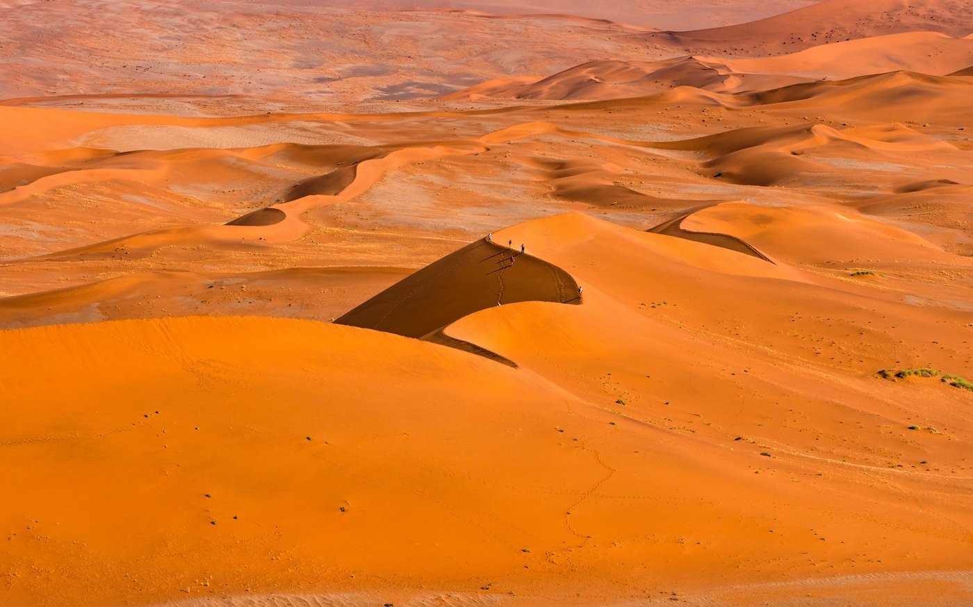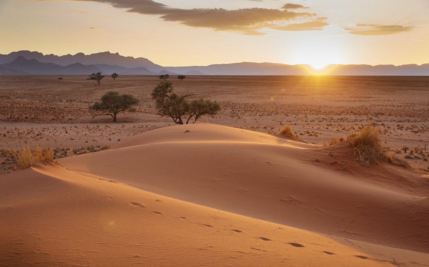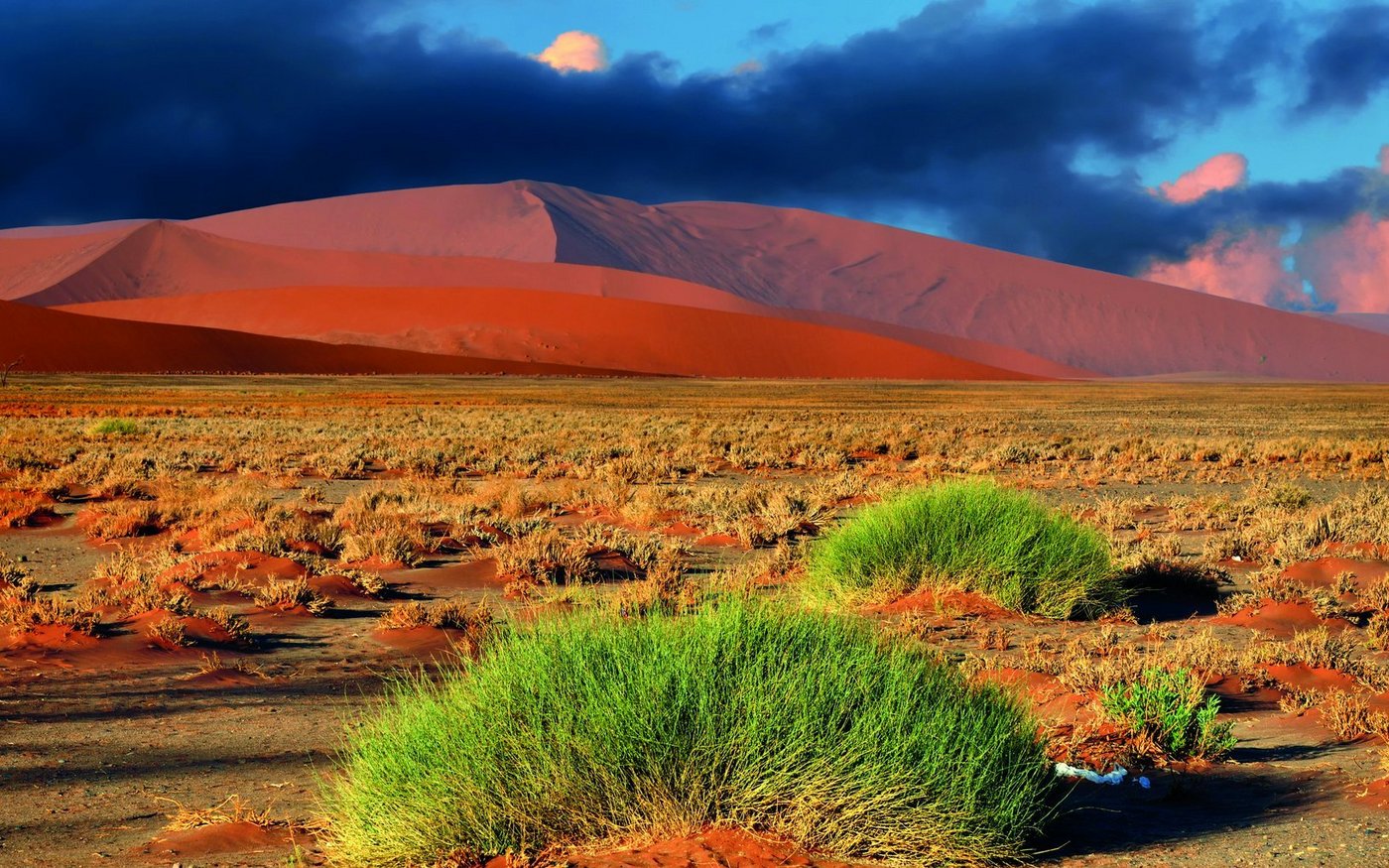 Frühmorgens starten Sie den Ausflug zum Sossusvlei. Die riesigen, ockerfarbenen Dünen des Sossusvlei bieten ein unvergessliches Panorama - bis zu 320 Meter hoch schweben sie zeitlos im Herzen der ältesten Wüste der Welt. Die weissen Vleis bilden einen scharfen Kontrast zu dem roten Sand und dem endlos blauen Himmel. Tiere und Pflanzen, die auf die nächtlichen Wüstennebel angewiesen sind, finden im Sand und unter den verwitterten Kameldornbäumen Zuflucht vor der schwellenden Mittagshitze. Der Tsauchab Fluss reicht tief in den 70 Kilometer breiten Dünengürtel der Namib bis nach Sossus hinein und hat sich dort nach besonders reichen Regenfällen ein Sammelbecken geschaffen - das Vlei (daher der Name Sossusvlei) - in dem das Wasser verdunstet und versickert.