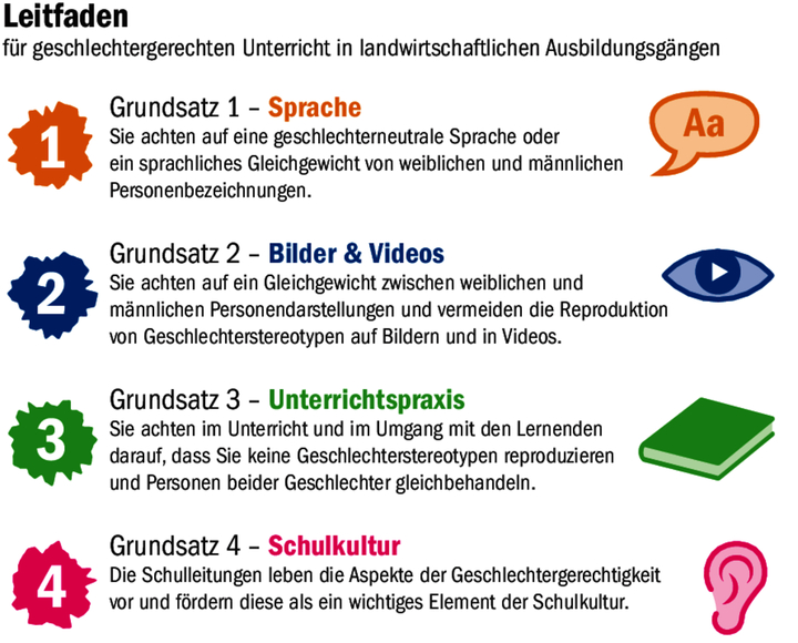 Sie stellte fest, dass Frauen in den EFZ-Unterlagen praktisch nicht vorkommen, und in den Unterlagen der Bäuerinnenausbildung nur in der Rolle als Bäuerin. Die Betriebsleiterin, die Züchterin, die Chefin gab es nicht – das war immer der Mann. Darum wollten wir ein grösseres Projekt starten, um einerseits empirisch zu untersuchen, ob ein Geschlechter-Ungleichgewicht in Sprache, Bildern und Rollen tatsächlich besteht, und andererseits, um konkrete Handlungsempfehlungen zu entwickeln. Denn manchmal glauben es die Leute erst, wenn Zahlen vorliegen. Die Ergebnisse der empirischen Analyse werden wir voraussichtlich noch diesen Herbst publizieren. Den Leitfaden haben wir nun priorisiert.