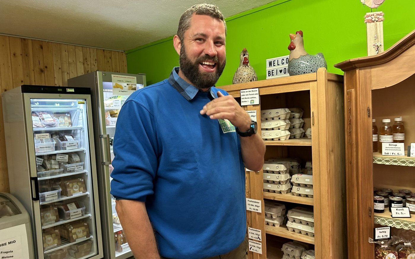 Das verriet der Senior, aber nun zu «Ogg. The Farmer», wie sich Betriebsleiter Philipp Ogg nennt. Der 43-jährige Meisterlandwirt setzt auf Direktvermarktung mit Selbstbedienung. Bezahlen kann die Kundschaft mit Karte, Twint oder bar. Auch ein Münzwechsler ist vorhanden. Seinen Hofladen schützt Ogg durch eine hochwertige Videoüberwachung vor Diebstählen. Das Sortiment ist vielfältig. Verkaufsrenner sind die Eier. Aus Eigenproduktion stehen Kartoffeln, Gemüse und Süssmais im Regal. Ergänzt wird das Sortiment durch Fleischwaren von Berufskollegen sowie ein regional hergestelltes italienisches Glaceangebot. [IMG 4]