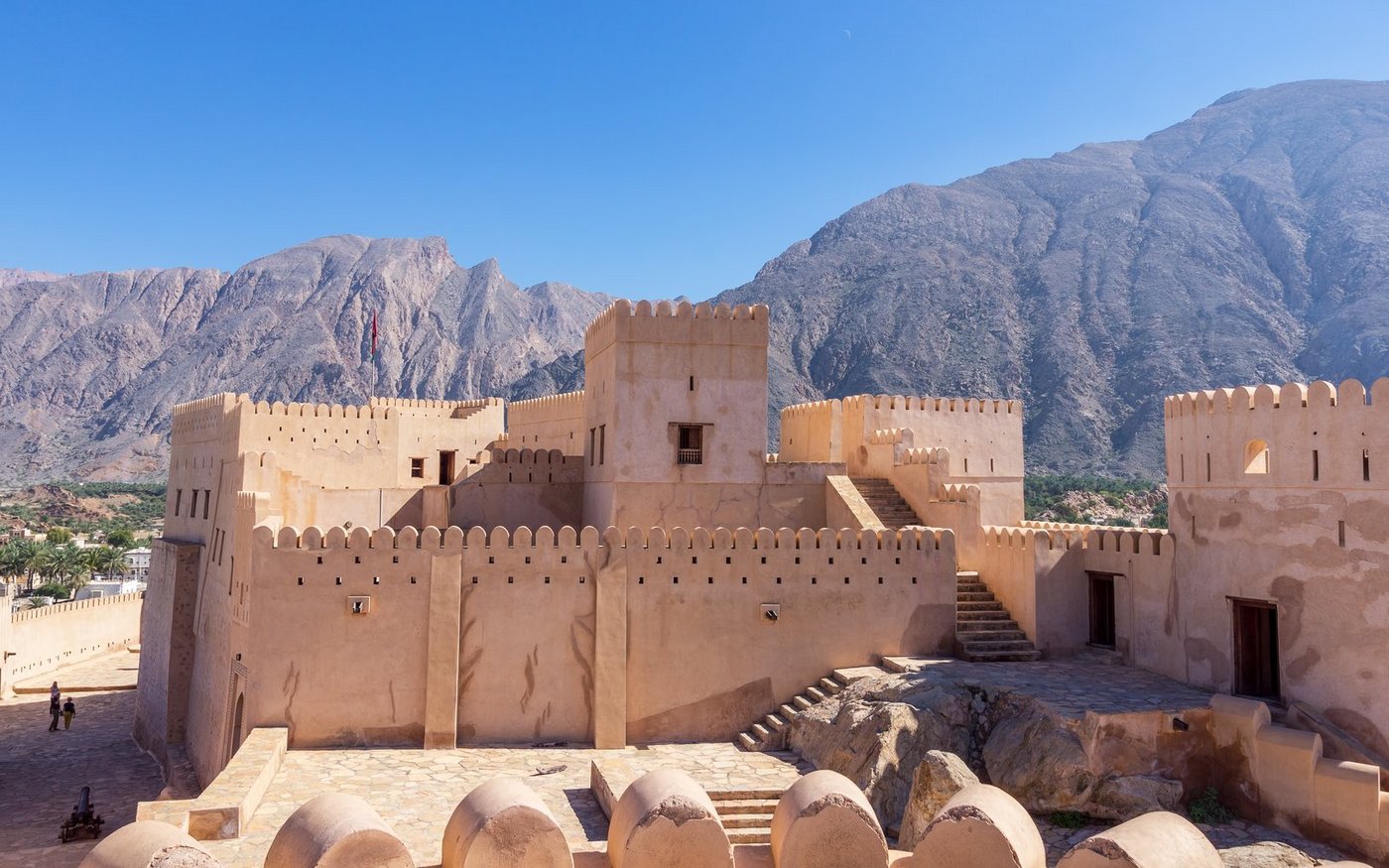 Nach dem Frühstück besuchen Sie den Fischmarkt an der Küste bei Seeb. Neben Fisch wird hier auch Gemüse verkauft. Danach fahren Sie durch die Batinah-Ebene nach Nakhl, um die Festung und die Thermalquellen zu besichtigen. Die historische Stadt liegt malerisch am Nordrand des Hadschar-Gebirges in der fruchtbaren Küstenebene al-Batina. Die Ursprünge der alten Festung reichen bis in die vorislamische Zeit zurück. Später wurde die Festung viele Male restauriert und renoviert. Sie wurde auf einem Felsen im traditionellen omanischen Stil errichtet. Heute beherbergt die Festung ein Museum.