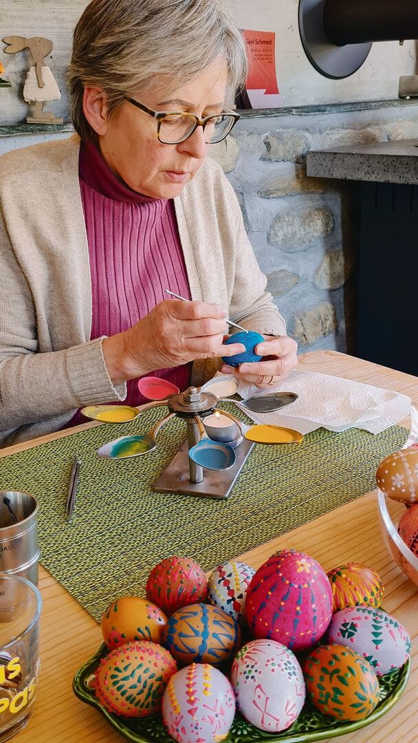 Pfisters renovierten ihr Haus und die Wirtin entdeckte für sich ein neues Hobby, nämlich das Bemalen von Ostereiern. Seitdem beschäftigt sie sich jedes Jahr vor Ostern damit, gekochte und ausgeblasene Eier zu bemalen. Mit ruhiger Hand und viel Geschick eignete sie sich dabei den alten Brauch der Sorben an. Sorben sind eine westslawische Minderheit, die vorwiegend in der Lausitz im östlichen Deutschland lebt. Laut Unesco zählt Sorbisch übrigens zu den bedrohten Sprachen. Genau wie das Rätoromanische, das auch in Schlans gesprochen wird.[IMG 2]
