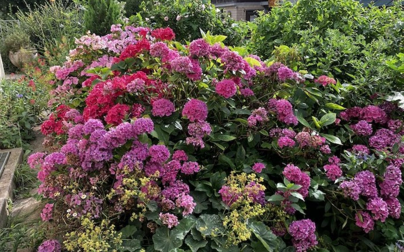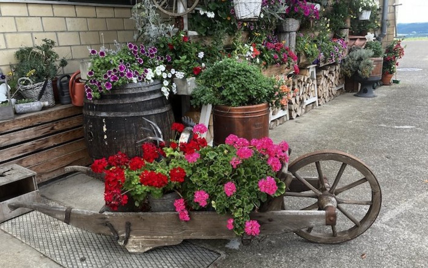 Hier fühlen sich Blumen zu Hause: Wohin man auch schaut, auf dem Zelglihof im thurgauischen Ermatingen blüht es in allen Farbtönen. Rote Rosen und Geranien, Hortensien in Pink, blaue Glockenblumen, orange Kapuzinerkresse und bald auch gelbe Sonnenblumen. All dies ist nicht etwa in einem eigentlichen Bauerngarten zu bewundern, wie man es erwarten könnte. Vielmehr wachsen die Blumen in Grüppchen überall da, wo es Platz hat. Beziehungsweise dort, wo Margrit Kreis dafür ein Plätzchen gefunden hat. Zum Beispiel in einer Badewanne, in einer Schubkarre oder in einem Baumstamm. Die einen in Töpfen, die anderen in Körben, alle schön und sorgfältig arrangiert.
