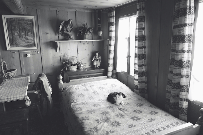 Wir sitzen im Halbschatten, warten auf das Mittagessen. Ein Stück Schweinefett brutzelt. Hörnli werden hinzugefügt und danach eine Handvoll Eier von den Hühnern, die gerade unter dem Balkon grasen. Eine Blumenvase ist auf dem Tisch, Spitzenvorhänge an den Fenstern und Drucke idyllischer Schweizer Landschaften an den Wänden. Und eine Tasse mit fein gehobeltem Käse, zwei Gläser eingemachter Früchte daneben, frische Äpfel und Zwetschgen, Apfel- und Zwetschgenmus. Ein Maggi-Fläschchen.