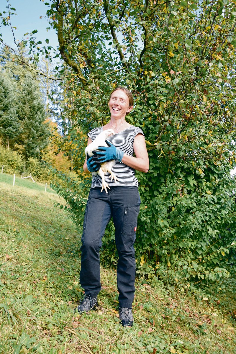 Ob sie mitkommen wolle, um Hühner einzufangen, wurde sie eines Tages von einer Freundin gefragt. Silvia kam das erste Mal in eine Poulethalle und half mit, die Hühner auszustallen. Dabei werden die Tiere im Maststall von Hand eingefangen und in Transportkisten verstaut, in denen sie dann zum Schlachtbetrieb gebracht werden. Je nach Alter und Gewicht der Tiere werden manchmal bis zu 15 Hühner in eine Kiste geladen, der jeweilige Betriebsleiter gibt dazu vorher die Anweisungen bekannt. Meistens werden jedoch zwölf Poulets in denselben Transportkäfig geladen. Silvia begann damit, die Käfige zu befüllen, sie musste mitzählen, damit nicht zu viele oder zu wenige Tiere eingeladen wurden, und die Klappe am Käfig schnell wieder schliessen, wenn die Hühner drin waren. Man muss sich ganz schön konzentrieren inmitten der flatternden Hühner. Sie war sofort begeistert von dieser Arbeit, freute sich, die anderen Hühnerfänger(innen) kennenzulernen. Das war 2012, auf einem Betrieb in der Nähe, seither geht die zierliche Frau manchmal bis zu dreimal pro Woche in einen Hühnerstall und fängt das Federvieh ein. «Man darf nicht zimperlich sein, man muss einfach zupacken. Du musst das schon wollen», meint sie auf die Frage, was es braucht, damit man diese strenge Arbeit machen kann. Dazu steht sie manchmal mitten in der Nacht auf. Ein Arbeitsbeginn um 1.15 Uhr nachts oder im Winter auf verschneiten Strassen vor halb vier Uhr früh alleine auf der Strasse unterwegs zu sein, das macht Silvia nichts aus, im Gegenteil: «Wenn ich so mutterseelenallein zum Hühnerladen fahre, dann denke ich, dass ich wohl der glücklichste Mensch bin!» Sie geht dreimal pro Woche rennen, powert sich gerne aus, so auch im Hühnerstall. Zusammen am gleichen Ziel zu arbeiten, nach der Anstrengung gemeinsam mit den anderen Helfer(innen) einen guten Zvieri oder Zmorge zu geniessen, alle verschwitzt und nach Hühnerstall riechend, das macht Silvia glücklich. «Du lernst so viele interessante Menschen kennen, das ist so schön und es ist mir noch nie verleidet!», strahlt Silvia. «Ich habe nie Rückenschmerzen, dank meiner guten Gesundheit kann ich diese Arbeit machen», sagt sie ernst. Silvia ist eben eine richtige Powerfrau.