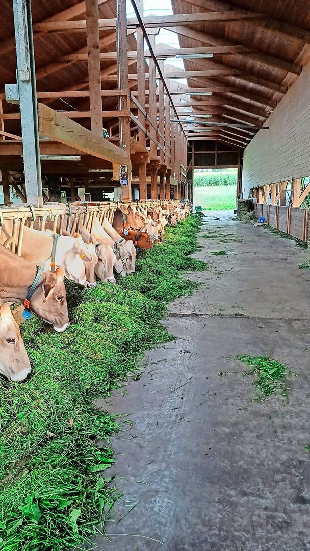 Für die Zukunft hat sie Pläne und Ideen, aber vorwegnehmen will sie nichts. «Ideen, auch wenn es sich nur um kleine Sachen handelt, möchte ich zuerst umsetzen können, bevor ich sie erzähle», bekräftigt sie. So ist sie jetzt jeden Morgen im Stall am Füttern und Ausmisten und abends am Melken. Tagsüber arbeitet sie vier Tage pro Woche im Büro, die restlichen Tage ganz auf dem Betrieb. Bei den Kühen ist sie voll involviert. Bei den Feldarbeiten entscheidet hauptsächlich noch ihr Vater. Sie sei oft ein bisschen hin- und hergerissen, sagt sie. «Auf dem Hof gibt es immer Arbeit und man verpasst stets etwas.» Manchmal würde sie am liebsten nur auf dem Hof arbeiten. Aber im Büro sei sie auf die Arbeit dort fokussiert, die ihr auch gefalle. Dieses Jahr ging es auch immer gut auf, dass sie fürs Heuen oder bei Bedarf freinehmen konnte.