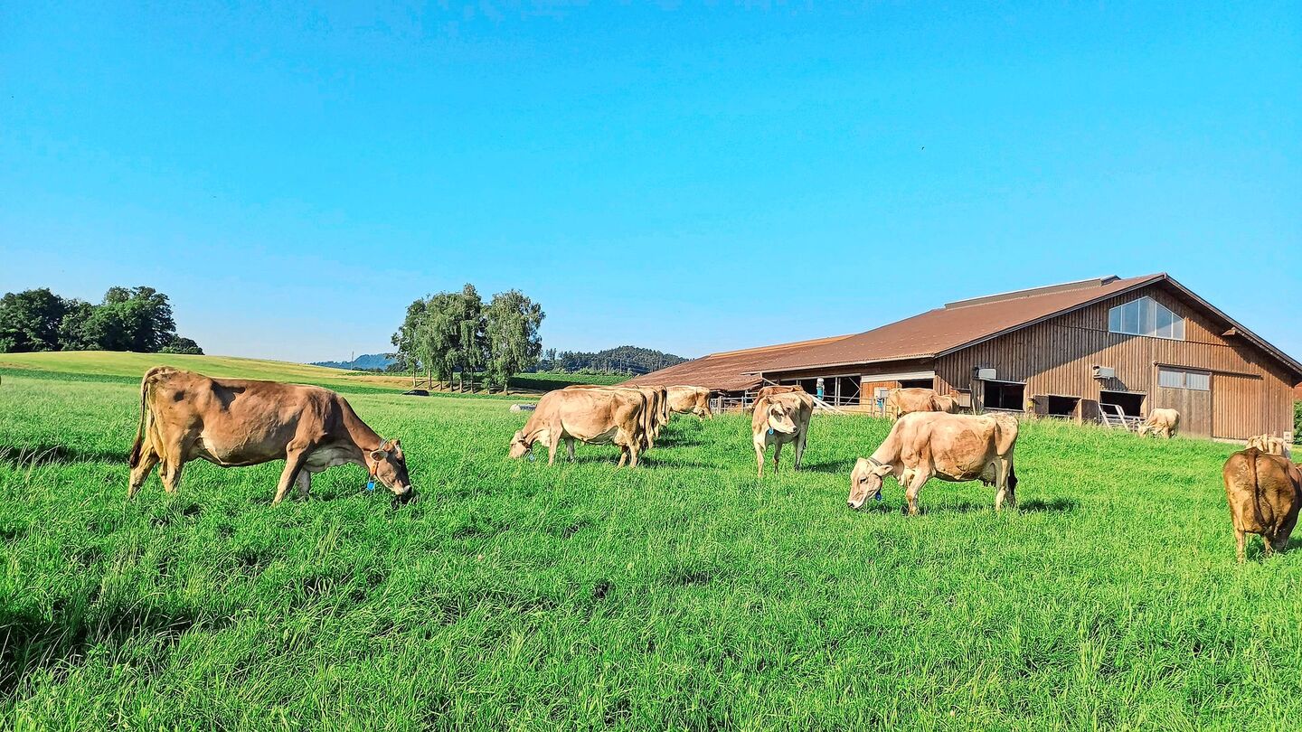 Die Milch der knapp 60 Braunviehkühe wird an die Käserei Wängi geliefert. Ein Teil der 30 Hektaren ist rund um den Stall arrondiert, ideal zum Weiden. Über den Sommer sind die Kühe halbtägig auf der Weide. Das System mit Portionenweide und Eingrasen hat sich bewährt.