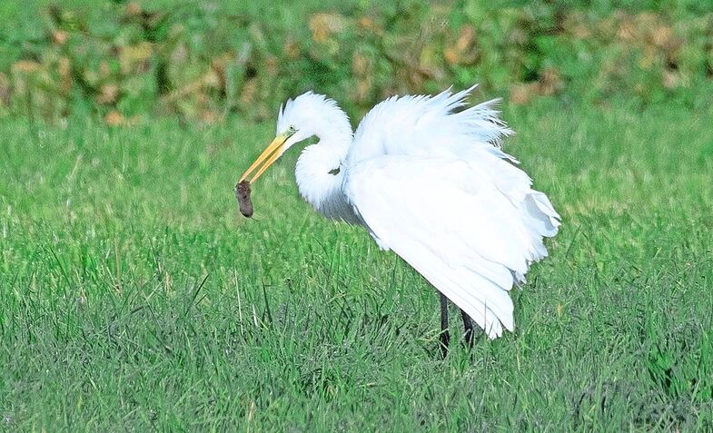 Die Rede ist von den Silberreihern. Vor rund fünfzig Jahren war diese Reiherart eine Seltenheit in der Schweiz. Inzwischen tritt sie regelmässig auf. Sie brütet inselhaft in Osteuropa. Der Silberreiher, Ardea alba, ist ein gewiefter Mäusejäger und -vertilger. Der Verfasser dieser Zeilen konnte beobachten, wie ein Silberreiher im Belpmoos innert einer Viertelstunde vier Feldmäuse fing und schluckte.