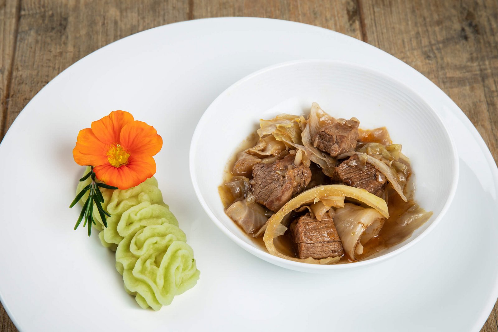 - Nun das angebratene Fleisch und den Kabis schichtweise in den Bräter zurückgeben. Fleischbouillon, Siedfleischsaft und Bratensauce dazugeben, aufkochen und dann bei mittlerer Hitze 30 Minuten köcheln lassen.
