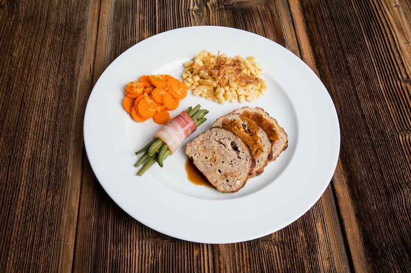 Den Hackbraten in Tranchen schneiden. Auf vorgewärmten Tellern einen Saucenspiegel bilden. Hackfleischtranchen darin anrichten. Knöpfli, Rüebli und Bohnen dazu anrichten.