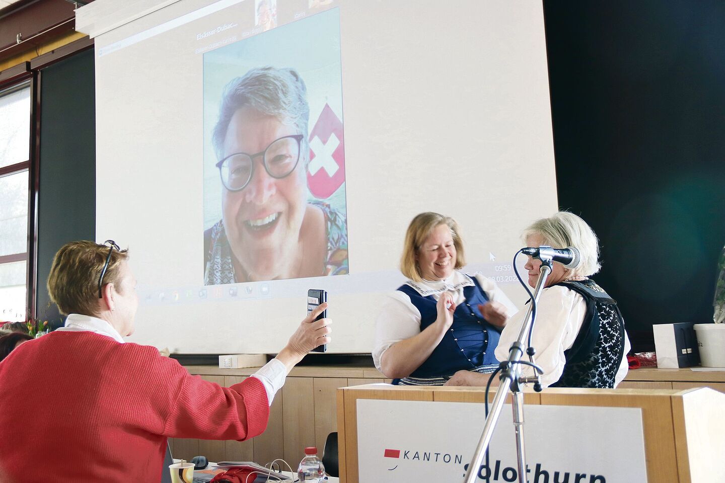 Seit 2020 teilen sich Ida Schaffter und Sieglinde Jäggi das Präsidium. «Oft werde ich gefragt», sagte Kassierin Marie-Theres Widmer, «ob Co-Präsidien funktionieren würden.» Sie bestätigte, beim SOBLV klappe es bestens. «Die zwei Frauen kommen aus der gleichen Gegend und haben ihre Aufgaben abgesprochen.» Es war ihre erste gemeinsame physische DV. Weil sie ihre Vorgängerin Rita Hänggi noch nicht offiziell verabschieden konnten, hatten sie einen Plan ausgeheckt. So hörten die Teilnehmerinnen auf einmal Ritas Stimme und sahen sie auf der Grossleinwand. Die Ex-Präsidentin verfolgte von hoher See, wo sie seit zwei Jahren mit ihrem Mann Blasius Bootsfahrten anbietet, die DV. «Rita war Bäuerin und Wirtin», schmunzelte Sieglinde Jäggi, «heute ist sie Seglerin.» Diese liess ihren Nachfolgerinnen die Insignien des Verbands, das Sitzungsglöcklein und die silbrige Arbeitsbiene, überreichen.