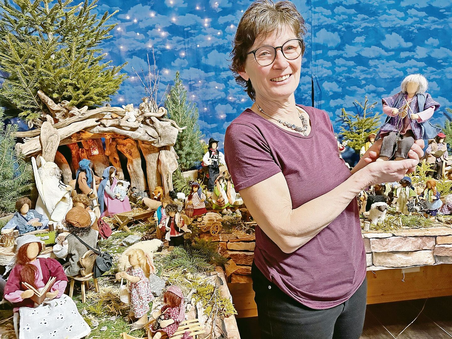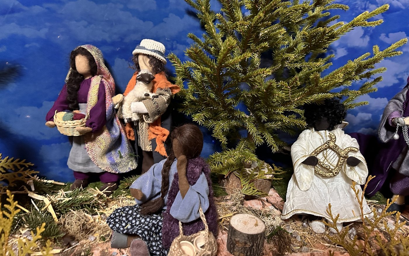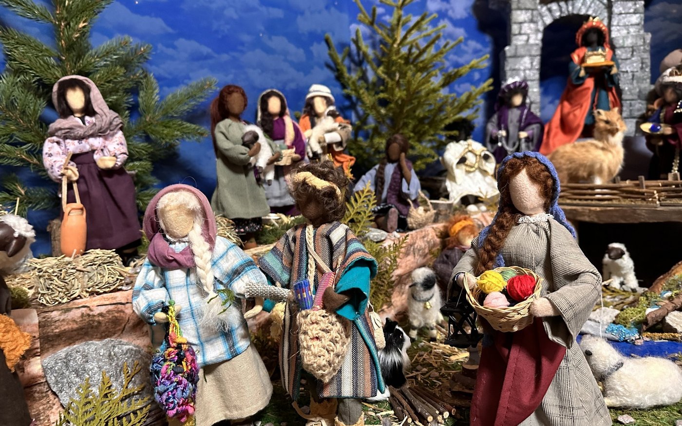 Die gesichtslosen Figuren sind gut erkennbar. So können die Betrachtenden ihrer Fantasie freien Lauf lassen. Wer die Personen aber kennt, sieht sofort, dass sich auch die Familie der Cavegns unter das Krippenvolk gemischt hat. So sitzt zum Beispiel Ritas Mutter auf einer Bank mit ihrer Enkelin. Ihre drei Kinder sowie die Grosseltern sind dabei. Und auch ihr Sternenkind, das sie noch immer schmerzlich vermisst, bekam einen Ehrenplatz als wunderschönes Engelchen am Krippendach.