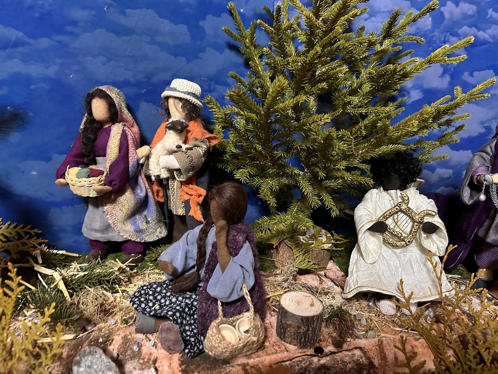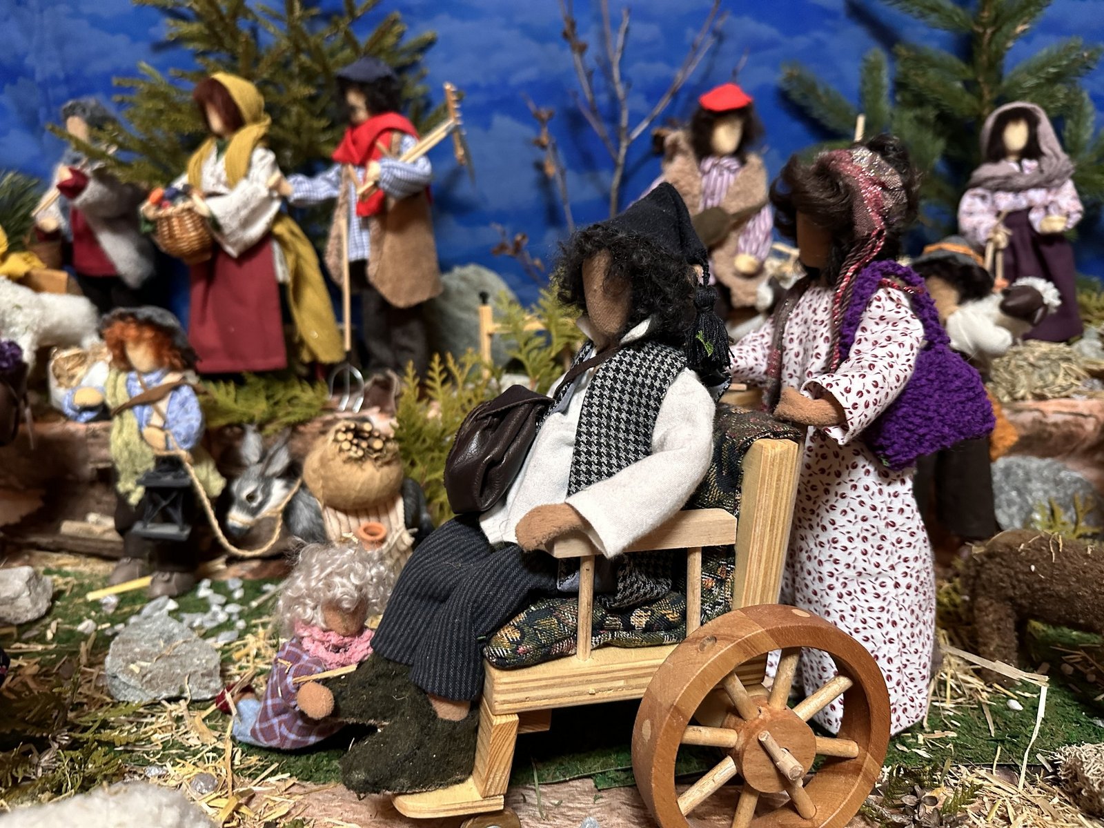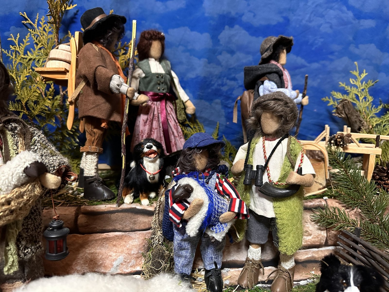 Die gesichtslosen Figuren sind gut erkennbar. So können die Betrachtenden ihrer Fantasie freien Lauf lassen. Wer die Personen aber kennt, sieht sofort, dass sich auch die Familie der Cavegns unter das Krippenvolk gemischt hat. So sitzt zum Beispiel Ritas Mutter auf einer Bank mit ihrer Enkelin. Ihre drei Kinder sowie die Grosseltern sind dabei. Und auch ihr Sternenkind, das sie noch immer schmerzlich vermisst, bekam einen Ehrenplatz als wunderschönes Engelchen am Krippendach.